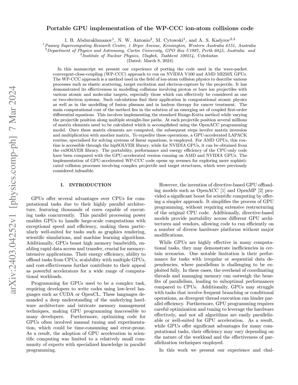 We present our experience of porting the code used in the wave-packet convergent-close-coupling (WP-CCC) approach to run on NVIDIA V100 and AMD MI250X GPUs. The WP-CCC approach is a method used in the field of ion-atom collision physics to describe various processes such as elastic scattering, target excitation and electron-capture by the projectile. It has demonstrated its effectiveness in modelling collisions involving proton or bare ion projectiles with various atomic and molecular targets, especially those which can be considered as one or two-electron systems. Such calculations find their application in computational atomic physics as well as in the modelling of fusion plasmas and in hadron therapy for cancer treatment. The main computational cost of the method lies in the solution of an emerging set of coupled first-order differential equations. This involves implementing the standard Runge-Kutta method while varying the projectile position along multiple straight-line paths. At each projectile position several millions of matrix elements need to be calculated which is accomplished using the OpenACC programming model. Once these matrix elements are computed, the subsequent steps involve matrix inversion and multiplication with another matrix. To expedite these operations, a GPU-accelerated LAPACK routine, specialised for solving systems of linear equations, is employed. For AMD GPUs, this routine is accessible through the hipSOLVER library, while for NVIDIA GPUs, it can be obtained from the cuSOLVER library. The portability, performance and energy efficiency of the CPU-only code have been compared with the GPU-accelerated version running on AMD and NVIDIA GPUs. The implementation of GPU-accelerated WP-CCC code opens up avenues for exploring more sophisticated collision processes involving complex projectile and target structures, which were previously considered infeasible.