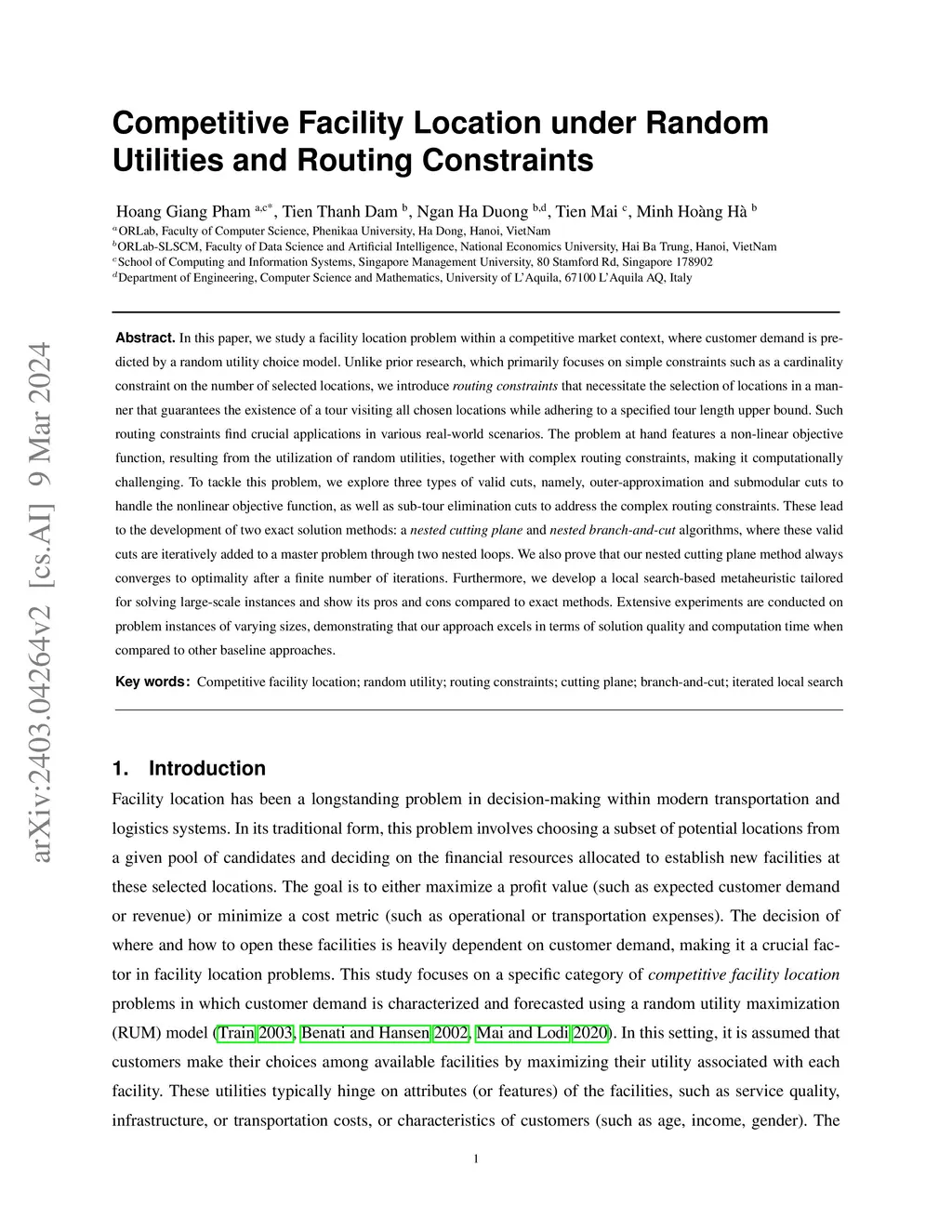 In this paper, we study a facility location problem within a competitive market context, where customer demand is predicted by a random utility choice model. Unlike prior research, which primarily focuses on simple constraints such as a cardinality constraint on the number of selected locations, we introduce routing constraints that necessitate the selection of locations in a manner that guarantees the existence of a tour visiting all chosen locations while adhering to a specified tour length upper bound. Such routing constraints find crucial applications in various real-world scenarios. The problem at hand features a non-linear objective function, resulting from the utilization of random utilities, together with complex routing constraints, making it computationally challenging. To tackle this problem, we explore three types of valid cuts, namely, outer-approximation and submodular cuts to handle the nonlinear objective function, as well as sub-tour elimination cuts to address the complex routing constraints. These lead to the development of two exact solution methods: a nested cutting plane and nested branch-and-cut algorithms, where these valid cuts are iteratively added to a master problem through two nested loops. We also prove that our nested cutting plane method always converges to optimality after a finite number of iterations. Furthermore, we develop a local search-based metaheuristic tailored for solving large-scale instances and show its pros and cons compared to exact methods. Extensive experiments are conducted on problem instances of varying sizes, demonstrating that our approach excels in terms of solution quality and computation time when compared to other baseline approaches.