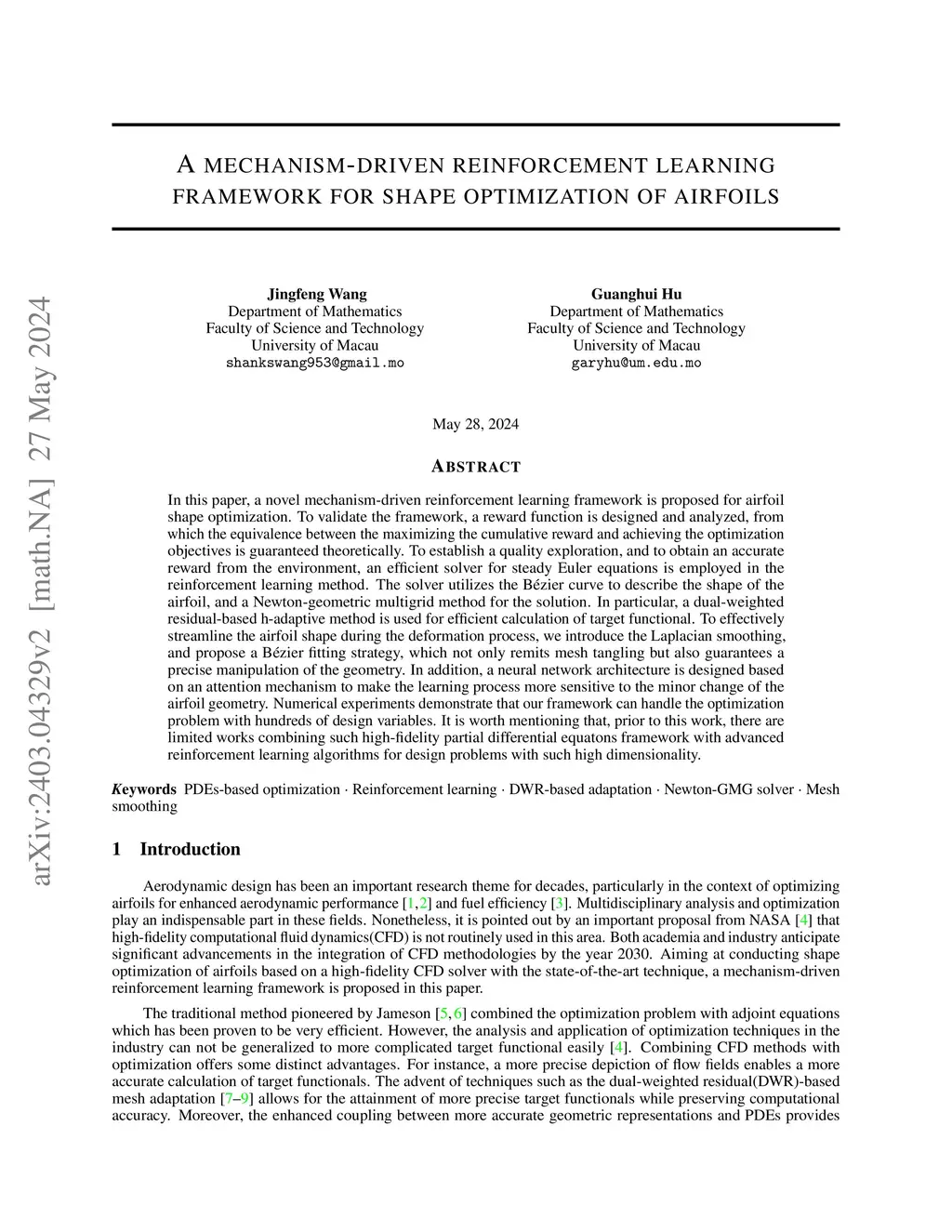 In this paper, a novel mechanism-driven reinforcement learning framework is proposed for airfoil shape optimization. To validate the framework, a reward function is designed and analyzed, from which the equivalence between the maximizing the cumulative reward and achieving the optimization objectives is guaranteed theoretically. To establish a quality exploration, and to obtain an accurate reward from the environment, an efficient solver for steady Euler equations is employed in the reinforcement learning method. The solver utilizes the B\ézier curve to describe the shape of the airfoil, and a Newton-geometric multigrid method for the solution. In particular, a dual-weighted residual-based h-adaptive method is used for efficient calculation of target functional. To effectively streamline the airfoil shape during the deformation process, we introduce the Laplacian smoothing, and propose a B\ézier fitting strategy, which not only remits mesh tangling but also guarantees a precise manipulation of the geometry. In addition, a neural network architecture is designed based on an attention mechanism to make the learning process more sensitive to the minor change of the airfoil geometry. Numerical experiments demonstrate that our framework can handle the optimization problem with hundreds of design variables. It is worth mentioning that, prior to this work, there are limited works combining such high-fidelity partial differential equatons framework with advanced reinforcement learning algorithms for design problems with such high dimensionality.