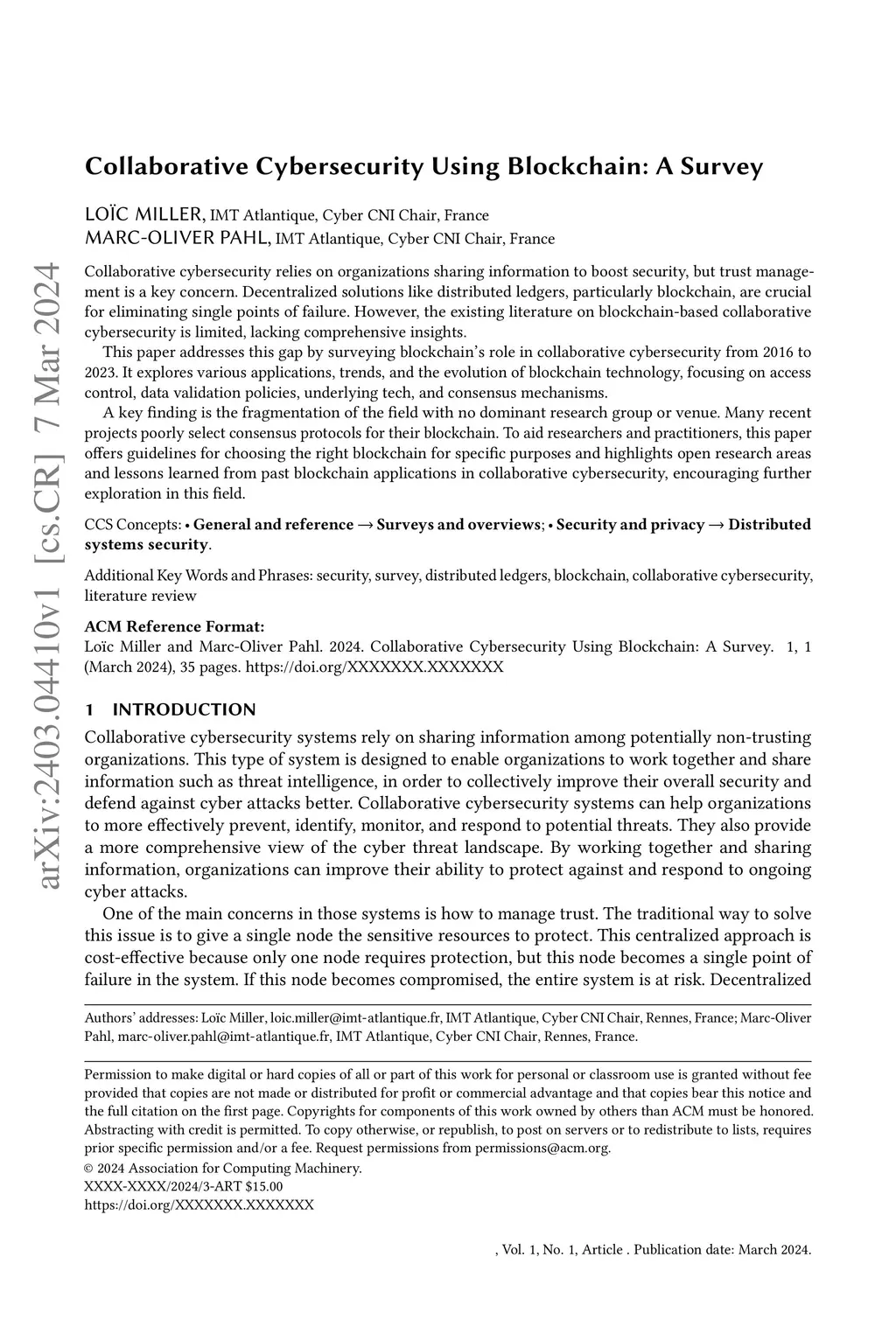 Collaborative Cybersecurity Using Blockchain: A Survey