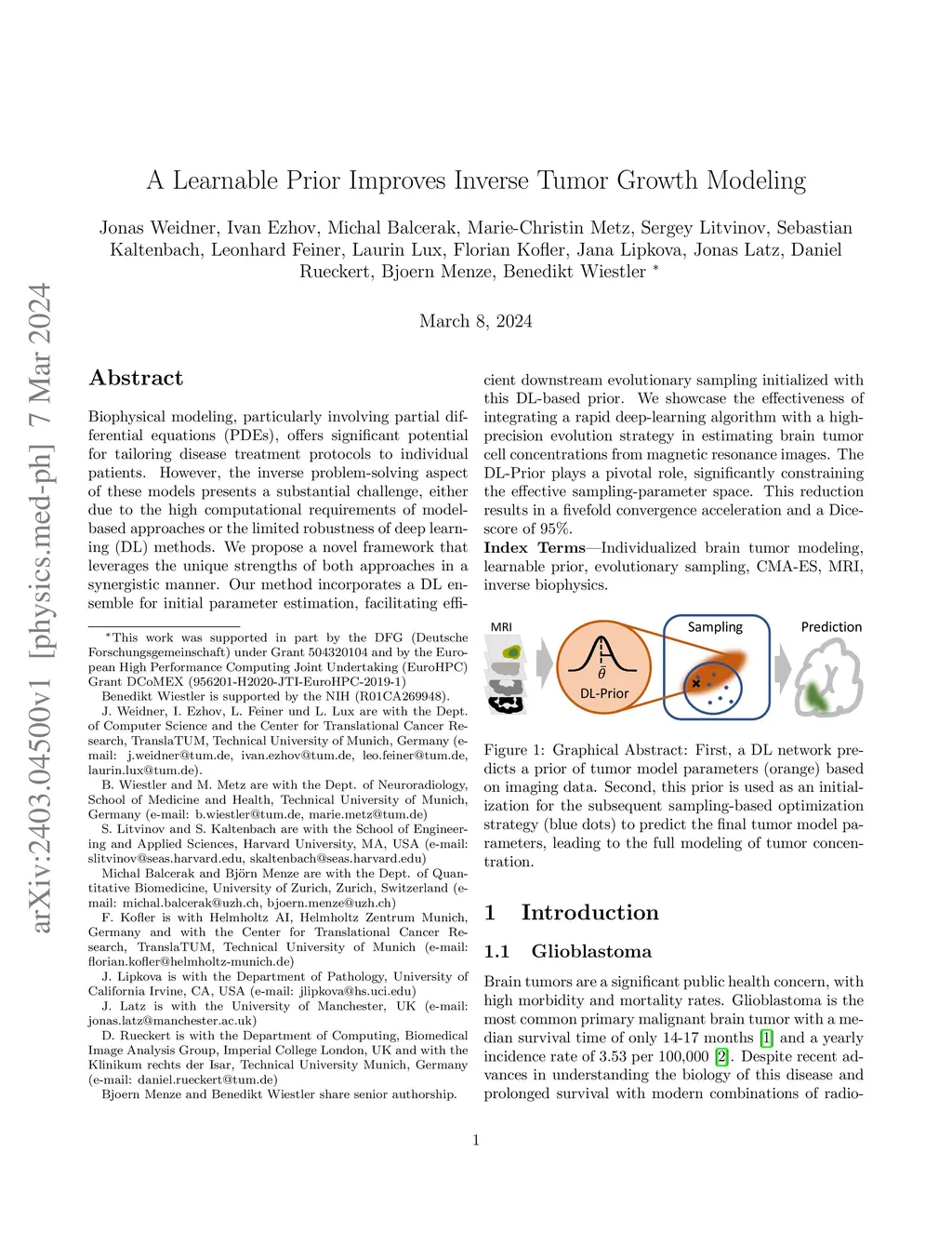 Biophysical modeling, particularly involving partial differential equations (PDEs), offers significant potential for tailoring disease treatment protocols to individual patients. However, the inverse problem-solving aspect of these models presents a substantial challenge, either due to the high computational requirements of model-based approaches or the limited robustness of deep learning (DL) methods. We propose a novel framework that leverages the unique strengths of both approaches in a synergistic manner. Our method incorporates a DL ensemble for initial parameter estimation, facilitating efficient downstream evolutionary sampling initialized with this DL-based prior. We showcase the effectiveness of integrating a rapid deep-learning algorithm with a high-precision evolution strategy in estimating brain tumor cell concentrations from magnetic resonance images. The DL-Prior plays a pivotal role, significantly constraining the effective sampling-parameter space. This reduction results in a fivefold convergence acceleration and a Dice-score of 95%