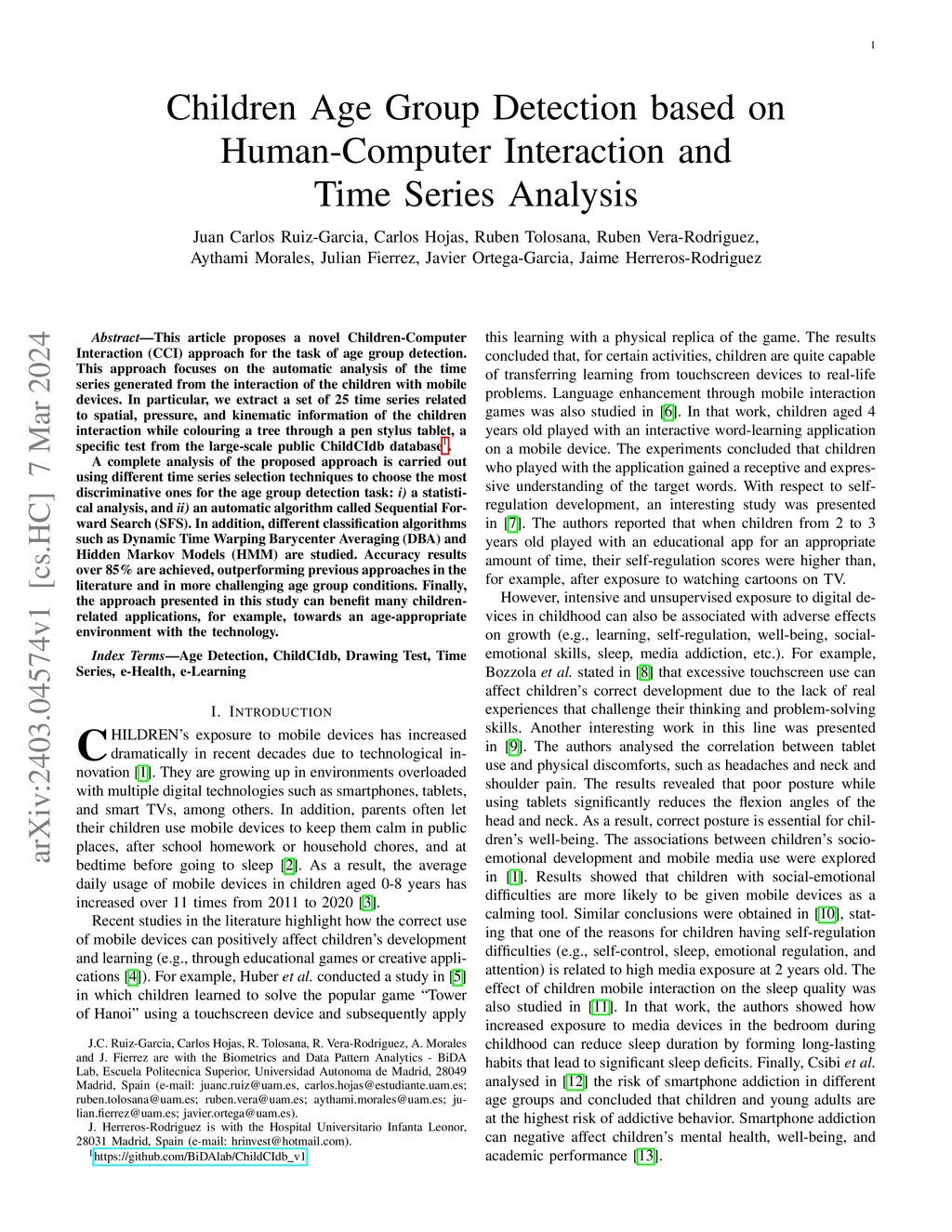 This article proposes a novel Children-Computer Interaction (CCI) approach for the task of age group detection. This approach focuses on the automatic analysis of the time series generated from the interaction of the children with mobile devices. In particular, we extract a set of 25 time series related to spatial, pressure, and kinematic information of the children interaction while colouring a tree through a pen stylus tablet, a specific test from the large-scale public ChildCIdb database. A complete analysis of the proposed approach is carried out using different time series selection techniques to choose the most discriminative ones for the age group detection task: i) a statistical analysis, and ii) an automatic algorithm called Sequential Forward Search (SFS). In addition, different classification algorithms such as Dynamic Time Warping Barycenter Averaging (DBA) and Hidden Markov Models (HMM) are studied. Accuracy results over 85% are achieved, outperforming previous approaches in the literature and in more challenging age group conditions. Finally, the approach presented in this study can benefit many children-related applications, for example, towards an age-appropriate environment with the technology.
