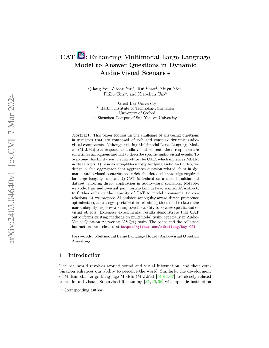 This paper focuses on the challenge of answering questions in scenarios that are composed of rich and complex dynamic audio-visual components. Although existing Multimodal Large Language Models (MLLMs) can respond to audio-visual content, these responses are sometimes ambiguous and fail to describe specific audio-visual events. To overcome this limitation, we introduce the CAT, which enhances MLLM in three ways: 1) besides straightforwardly bridging audio and video, we design a clue aggregator that aggregates question-related clues in dynamic audio-visual scenarios to enrich the detailed knowledge required for large language models. 2) CAT is trained on a mixed multimodal dataset, allowing direct application in audio-visual scenarios. Notably, we collect an audio-visual joint instruction dataset named AVinstruct, to further enhance the capacity of CAT to model cross-semantic correlations. 3) we propose AI-assisted ambiguity-aware direct preference optimization, a strategy specialized in retraining the model to favor the non-ambiguity response and improve the ability to localize specific audio-visual objects. Extensive experimental results demonstrate that CAT outperforms existing methods on multimodal tasks, especially in Audio-Visual Question Answering (AVQA) tasks. The codes and the collected instructions are released at https://github.com/rikeilong/Bay-CAT.