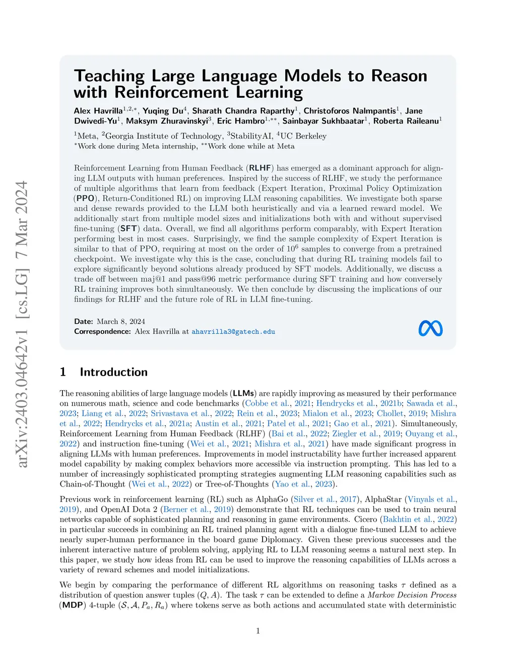 Teaching Large Language Models to Reason with Reinforcement Learning