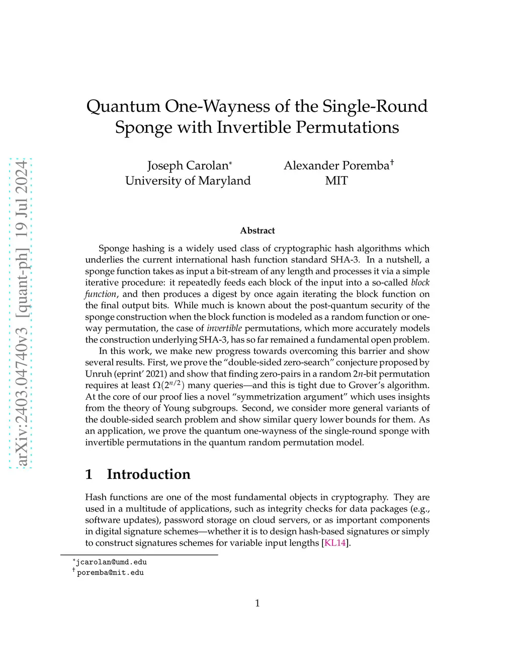 Sponge hashing is a widely used class of cryptographic hash algorithms which underlies the current international hash function standard SHA-3. In a nutshell, a sponge function takes as input a bit-stream of any length and processes it via a simple iterative procedure: it repeatedly feeds each block of the input into a so-called block function, and then produces a digest by once again iterating the block function on the final output bits. While much is known about the post-quantum security of the sponge construction when the block function is modeled as a random function or one-way permutation, the case of invertible permutations, which more accurately models the construction underlying SHA-3, has so far remained a fundamental open problem. In this work, we make new progress towards overcoming this barrier and show several results. First, we prove the "double-sided zero-search" conjecture proposed by Unruh (eprint' 2021) and show that finding zero-pairs in a random -bit permutation requires at least many queries -- and this is tight due to Grover's algorithm. At the core of our proof lies a novel "symmetrization argument" which uses insights from the theory of Young subgroups. Second, we consider more general variants of the double-sided search problem and show similar query lower bounds for them. As an application, we prove the quantum one-wayness of the single-round sponge with invertible permutations in the quantum random oracle model.