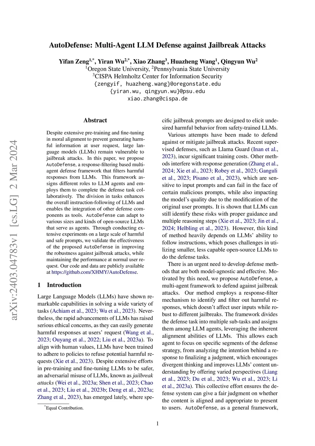 AutoDefense: Multi-Agent LLM Defense against Jailbreak Attacks