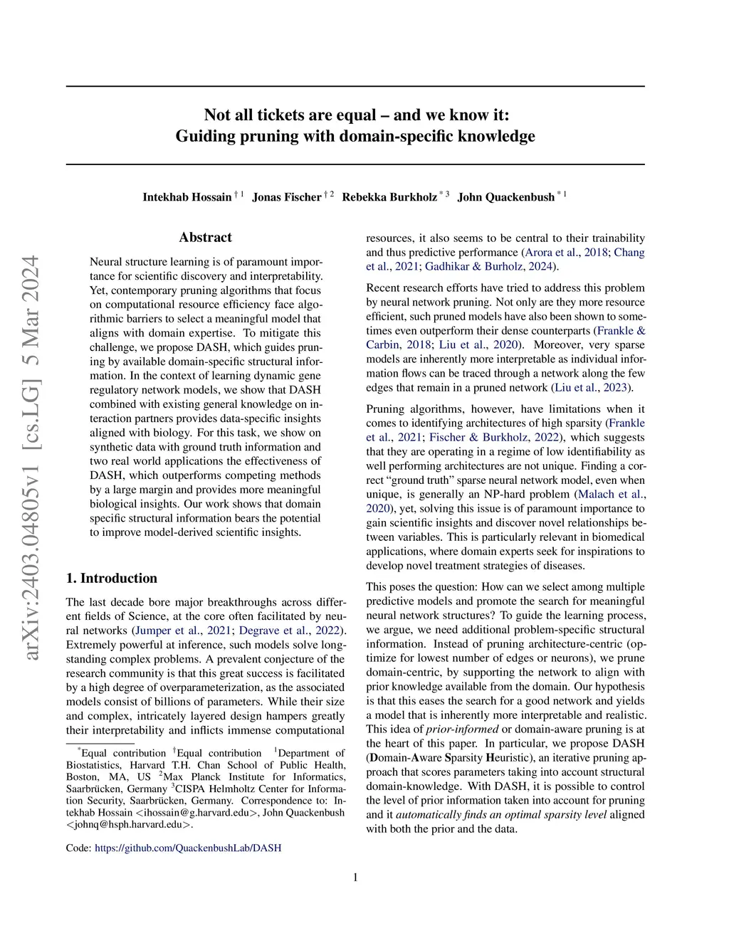 Neural structure learning is of paramount importance for scientific discovery and interpretability. Yet, contemporary pruning algorithms that focus on computational resource efficiency face algorithmic barriers to select a meaningful model that aligns with domain expertise. To mitigate this challenge, we propose DASH, which guides pruning by available domain-specific structural information. In the context of learning dynamic gene regulatory network models, we show that DASH combined with existing general knowledge on interaction partners provides data-specific insights aligned with biology. For this task, we show on synthetic data with ground truth information and two real world applications the effectiveness of DASH, which outperforms competing methods by a large margin and provides more meaningful biological insights. Our work shows that domain specific structural information bears the potential to improve model-derived scientific insights.