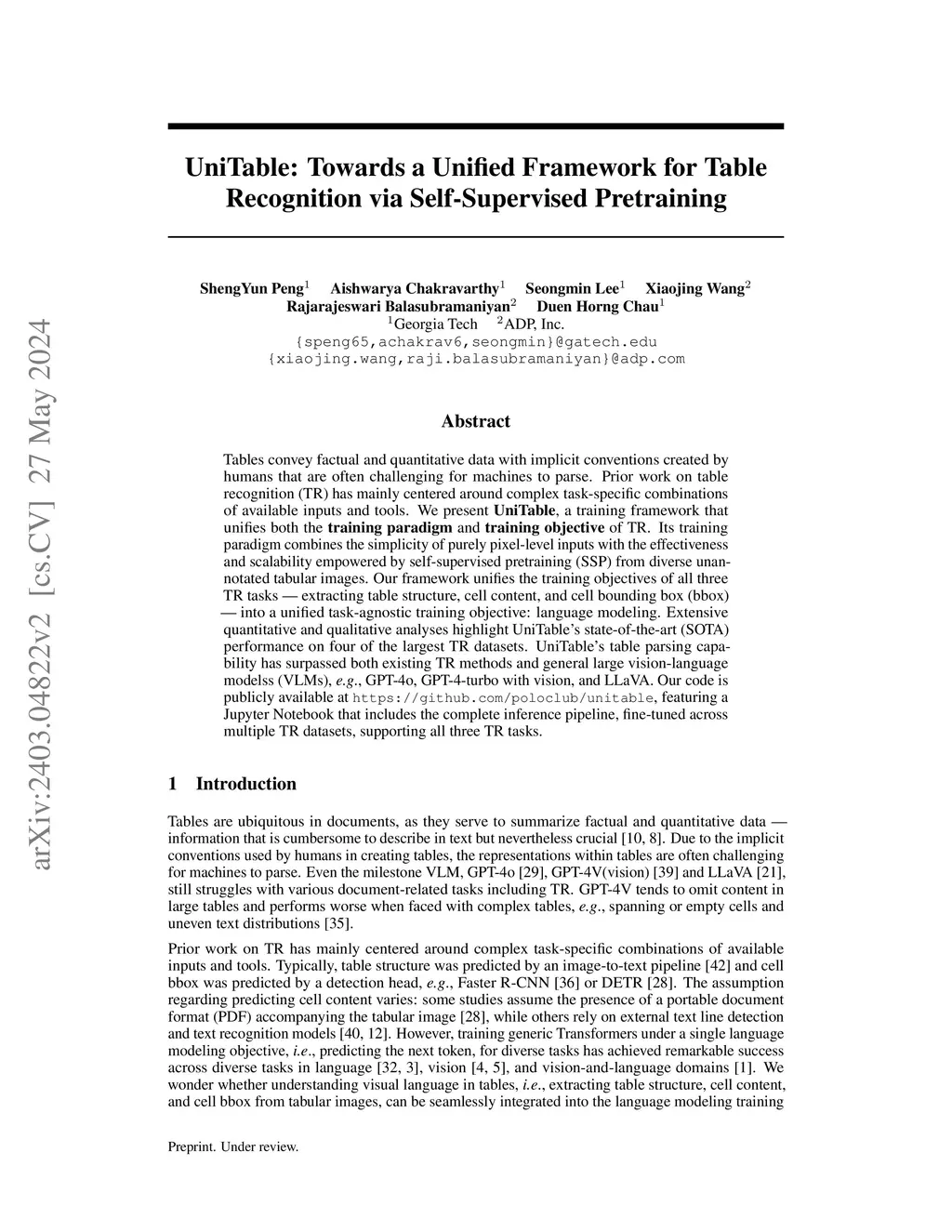Tables convey factual and quantitative data with implicit conventions created by humans that are often challenging for machines to parse. Prior work on table recognition (TR) has mainly centered around complex task-specific combinations of available inputs and tools. We present UniTable, a training framework that unifies both the training paradigm and training objective of TR. Its training paradigm combines the simplicity of purely pixel-level inputs with the effectiveness and scalability empowered by self-supervised pretraining from diverse unannotated tabular images. Our framework unifies the training objectives of all three TR tasks - extracting table structure, cell content, and cell bounding box - into a unified task-agnostic training objective: language modeling. Extensive quantitative and qualitative analyses highlight UniTable's state-of-the-art (SOTA) performance on four of the largest TR datasets. UniTable's table parsing capability has surpassed both existing TR methods and general large vision-language models, e.g., GPT-4o, GPT-4-turbo with vision, and LLaVA. Our code is publicly available at https://github.com/poloclub/unitable, featuring a Jupyter Notebook that includes the complete inference pipeline, fine-tuned across multiple TR datasets, supporting all three TR tasks.