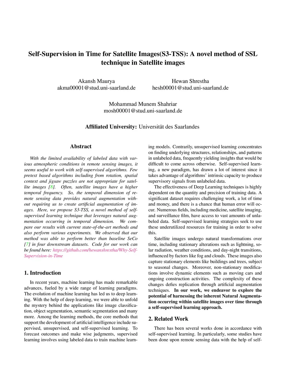 Self-Supervision in Time for Satellite Images(S3-TSS): A novel method of SSL technique in Satellite images