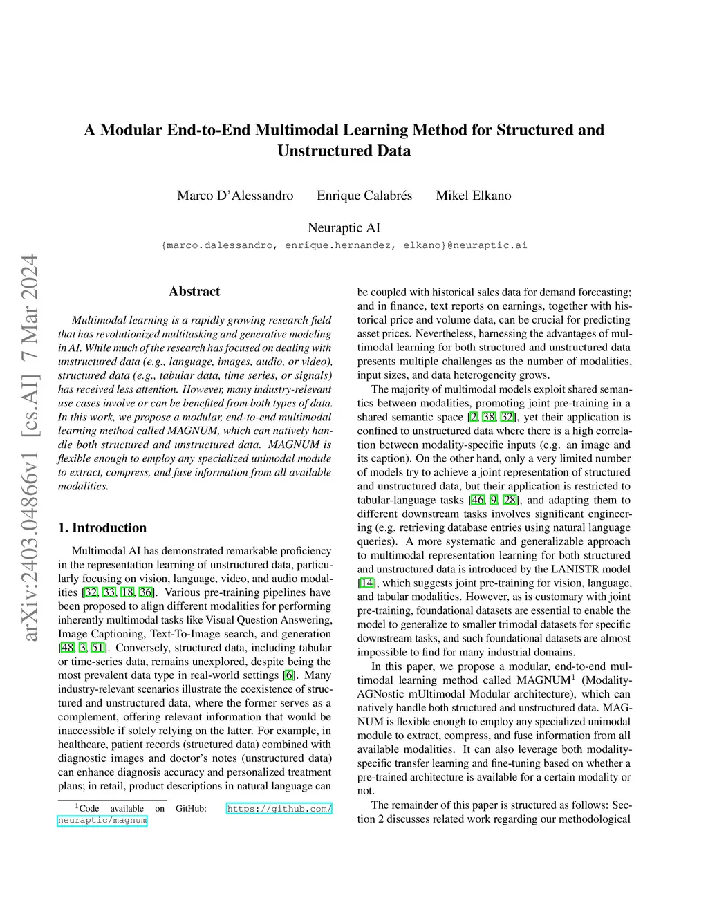 Multimodal learning is a rapidly growing research field that has revolutionized multitasking and generative modeling in AI. While much of the research has focused on dealing with unstructured data (e.g., language, images, audio, or video), structured data (e.g., tabular data, time series, or signals) has received less attention. However, many industry-relevant use cases involve or can be benefited from both types of data. In this work, we propose a modular, end-to-end multimodal learning method called MAGNUM, which can natively handle both structured and unstructured data. MAGNUM is flexible enough to employ any specialized unimodal module to extract, compress, and fuse information from all available modalities.