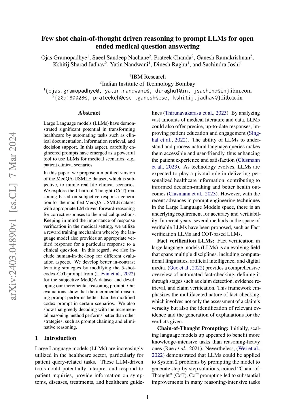 Large Language models (LLMs) have demonstrated significant potential in transforming healthcare by automating tasks such as clinical documentation, information retrieval, and decision support. In this aspect, carefully engineered prompts have emerged as a powerful tool for using LLMs for medical scenarios, e.g., patient clinical scenarios. In this paper, we propose a modified version of the MedQA-USMLE dataset, which is subjective, to mimic real-life clinical scenarios. We explore the Chain of Thought (CoT) reasoning based on subjective response generation for the modified MedQA-USMLE dataset with appropriate LM-driven forward reasoning for correct responses to the medical questions. Keeping in mind the importance of response verification in the medical setting, we utilize a reward training mechanism whereby the language model also provides an appropriate verified response for a particular response to a clinical question. In this regard, we also include human-in-the-loop for different evaluation aspects. We develop better in-contrast learning strategies by modifying the 5-shot-codex-CoT-prompt from arXiv:2207.08143 for the subjective MedQA dataset and developing our incremental-reasoning prompt. Our evaluations show that the incremental reasoning prompt performs better than the modified codex prompt in certain scenarios. We also show that greedy decoding with the incremental reasoning method performs better than other strategies, such as prompt chaining and eliminative reasoning.