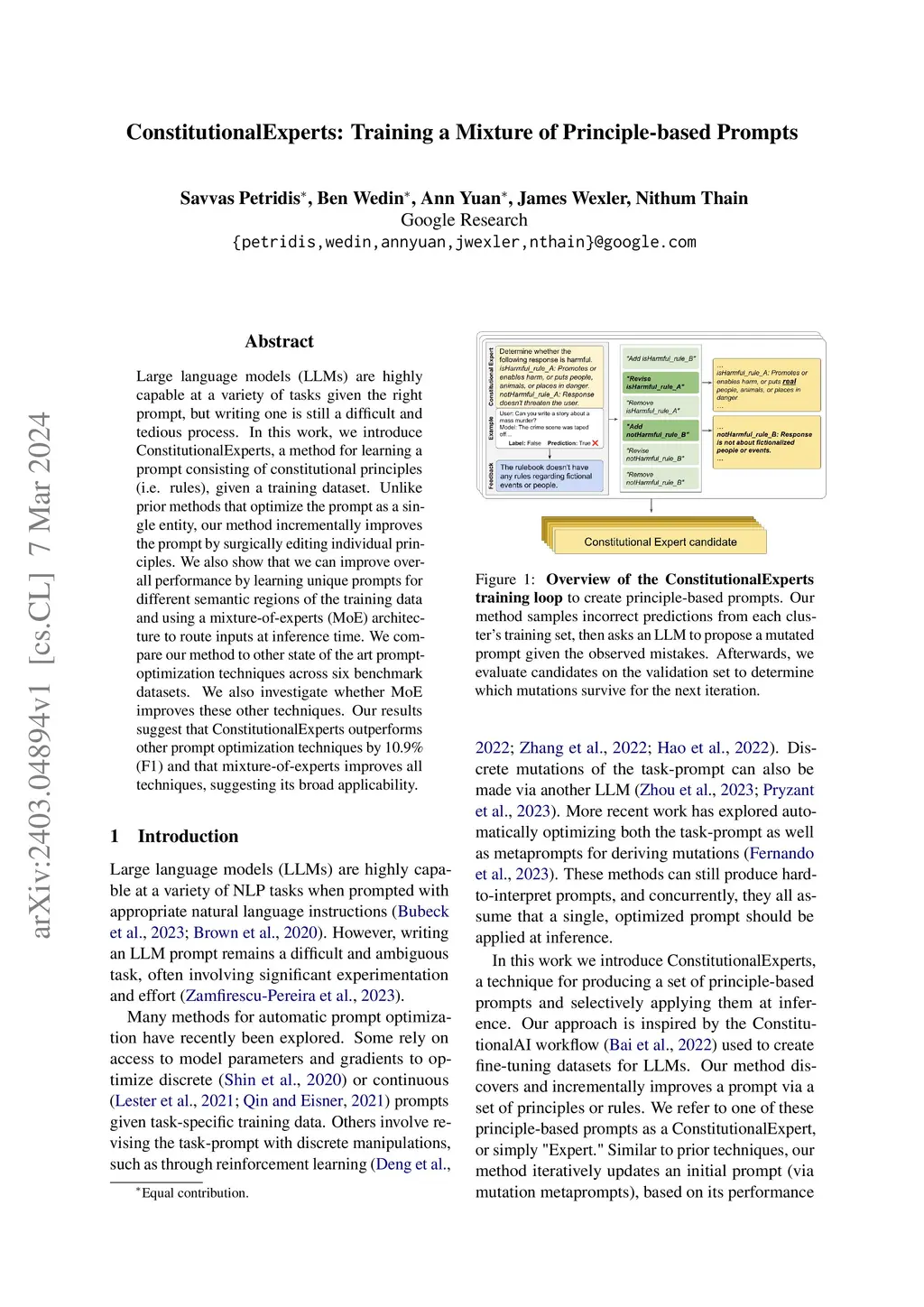 Large language models (LLMs) are highly capable at a variety of tasks given the right prompt, but writing one is still a difficult and tedious process. In this work, we introduce ConstitutionalExperts, a method for learning a prompt consisting of constitutional principles (i.e. rules), given a training dataset. Unlike prior methods that optimize the prompt as a single entity, our method incrementally improves the prompt by surgically editing individual principles. We also show that we can improve overall performance by learning unique prompts for different semantic regions of the training data and using a mixture-of-experts (MoE) architecture to route inputs at inference time. We compare our method to other state of the art prompt-optimization techniques across six benchmark datasets. We also investigate whether MoE improves these other techniques. Our results suggest that ConstitutionalExperts outperforms other prompt optimization techniques by 10.9% (F1) and that mixture-of-experts improves all techniques, suggesting its broad applicability.