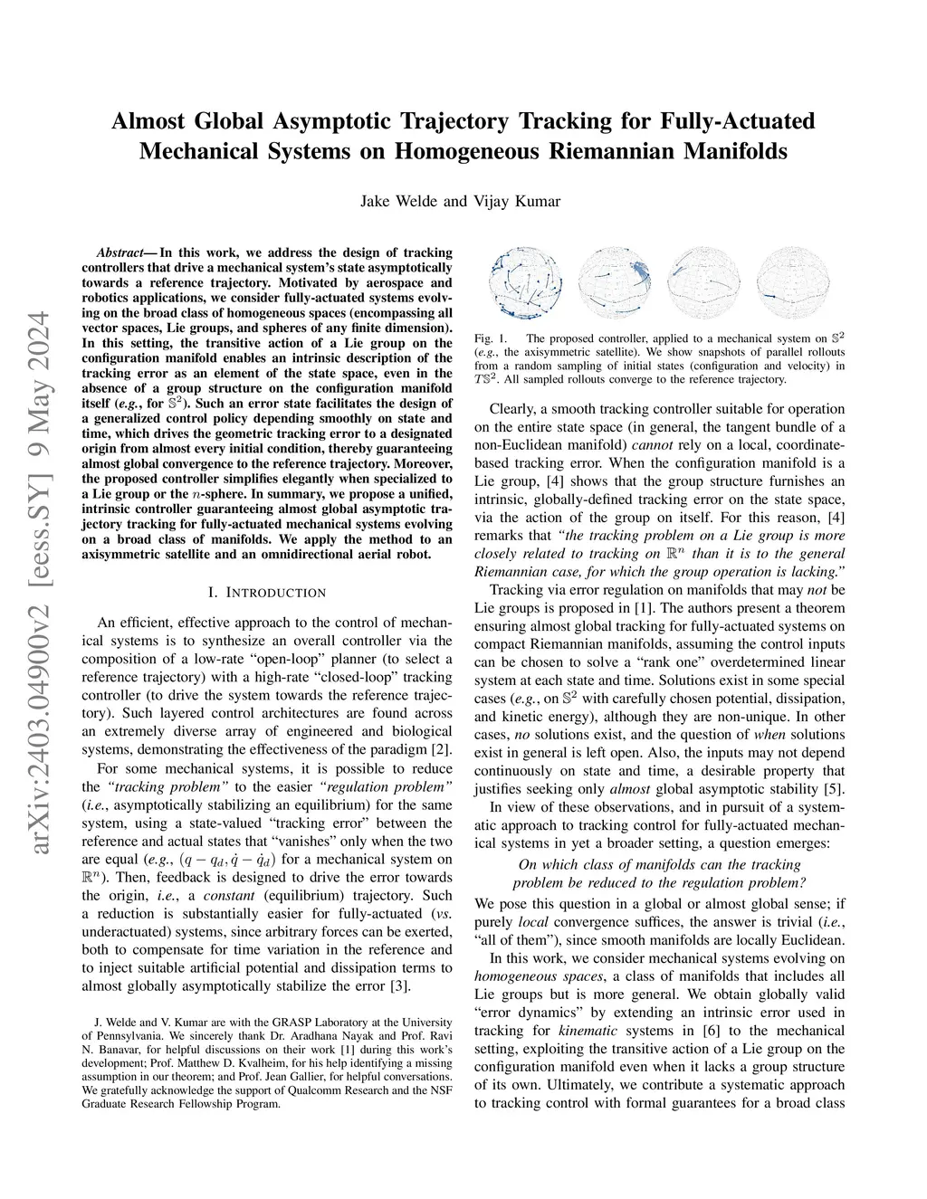 In this work, we address the design of tracking controllers that drive a mechanical system's state asymptotically towards a reference trajectory. Motivated by aerospace and robotics applications, we consider fully-actuated systems evolving on the broad class of homogeneous spaces (encompassing all vector spaces, Lie groups, and spheres of any finite dimension). In this setting, the transitive action of a Lie group on the configuration manifold enables an intrinsic description of the tracking error as an element of the state space, even in the absence of a group structure on the configuration manifold itself (e.g., for ). Such an error state facilitates the design of a generalized control policy depending smoothly on state and time, which drives the geometric tracking error to a designated origin from almost every initial condition, thereby guaranteeing almost global convergence to the reference trajectory. Moreover, the proposed controller simplifies elegantly when specialized to a Lie group or the n-sphere. In summary, we propose a unified, intrinsic controller guaranteeing almost global asymptotic trajectory tracking for fully-actuated mechanical systems evolving on a broad class of manifolds. We apply the method to an axisymmetric satellite and an omnidirectional aerial robot.