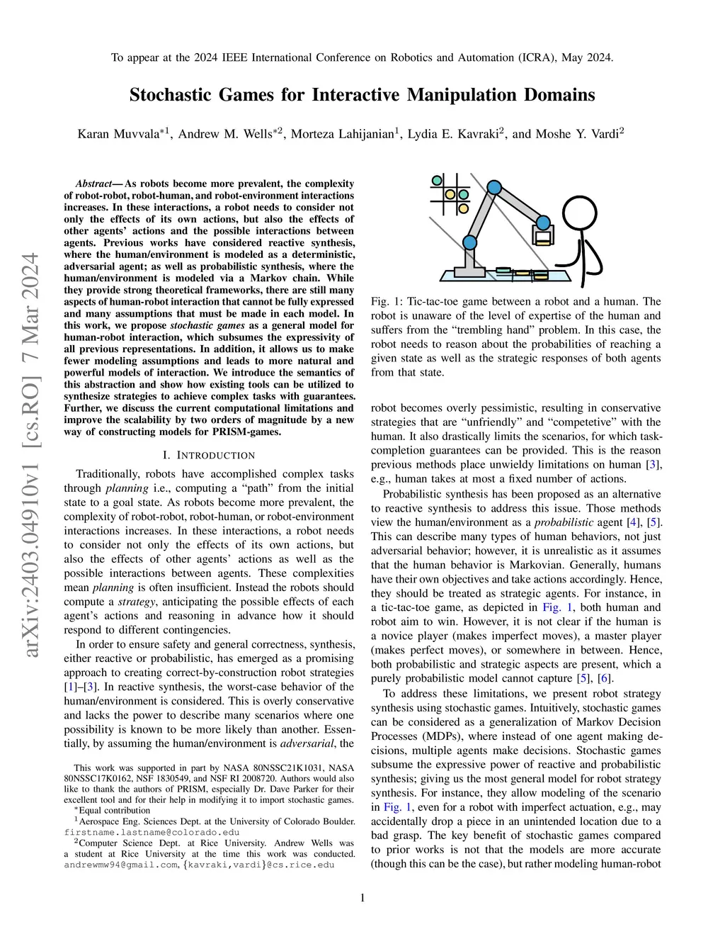 As robots become more prevalent, the complexity of robot-robot, robot-human, and robot-environment interactions increases. In these interactions, a robot needs to consider not only the effects of its own actions, but also the effects of other agents' actions and the possible interactions between agents. Previous works have considered reactive synthesis, where the human/environment is modeled as a deterministic, adversarial agent; as well as probabilistic synthesis, where the human/environment is modeled via a Markov chain. While they provide strong theoretical frameworks, there are still many aspects of human-robot interaction that cannot be fully expressed and many assumptions that must be made in each model. In this work, we propose stochastic games as a general model for human-robot interaction, which subsumes the expressivity of all previous representations. In addition, it allows us to make fewer modeling assumptions and leads to more natural and powerful models of interaction. We introduce the semantics of this abstraction and show how existing tools can be utilized to synthesize strategies to achieve complex tasks with guarantees. Further, we discuss the current computational limitations and improve the scalability by two orders of magnitude by a new way of constructing models for PRISM-games.