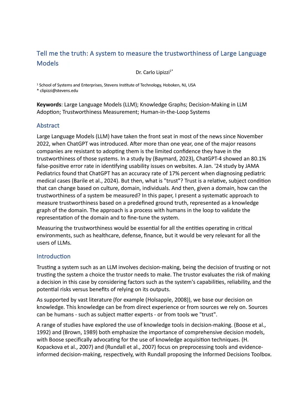 Large Language Models (LLM) have taken the front seat in most of the news since November 2022, when ChatGPT was introduced. After more than one year, one of the major reasons companies are resistant to adopting them is the limited confidence they have in the trustworthiness of those systems. In a study by (Baymard, 2023), ChatGPT-4 showed an 80.1% false-positive error rate in identifying usability issues on websites. A Jan. '24 study by JAMA Pediatrics found that ChatGPT has an accuracy rate of 17% percent when diagnosing pediatric medical cases (Barile et al., 2024). But then, what is "trust"? Trust is a relative, subject condition that can change based on culture, domain, individuals. And then, given a domain, how can the trustworthiness of a system be measured? In this paper, I present a systematic approach to measure trustworthiness based on a predefined ground truth, represented as a knowledge graph of the domain. The approach is a process with humans in the loop to validate the representation of the domain and to fine-tune the system. Measuring the trustworthiness would be essential for all the entities operating in critical environments, such as healthcare, defense, finance, but it would be very relevant for all the users of LLMs.