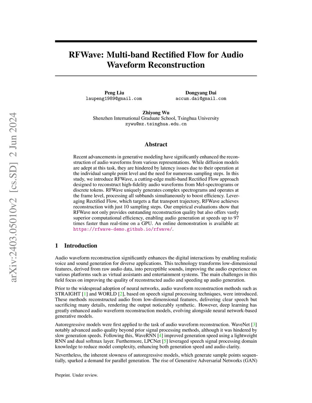 Recent advancements in generative modeling have significantly enhanced the reconstruction of audio waveforms from various representations. While diffusion models are adept at this task, they are hindered by latency issues due to their operation at the individual sample point level and the need for numerous sampling steps. In this study, we introduce RFWave, a cutting-edge multi-band Rectified Flow approach designed to reconstruct high-fidelity audio waveforms from Mel-spectrograms or discrete tokens. RFWave uniquely generates complex spectrograms and operates at the frame level, processing all subbands simultaneously to boost efficiency. Leveraging Rectified Flow, which targets a flat transport trajectory, RFWave achieves reconstruction with just 10 sampling steps. Our empirical evaluations show that RFWave not only provides outstanding reconstruction quality but also offers vastly superior computational efficiency, enabling audio generation at speeds up to 97 times faster than real-time on a GPU. An online demonstration is available at: https://rfwave-demo.github.io/rfwave/.