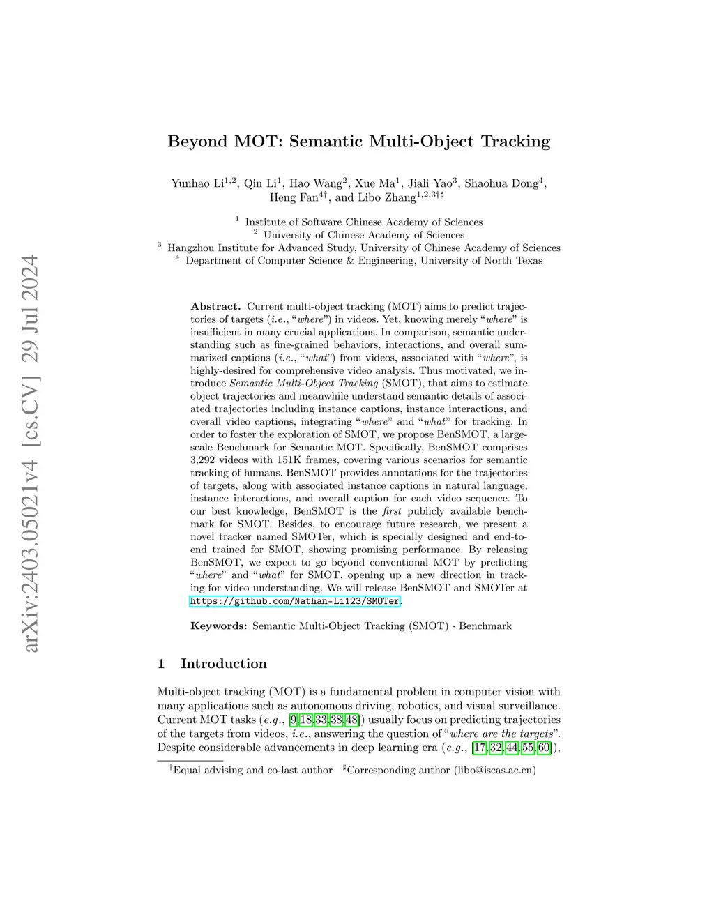 Current multi-object tracking (MOT) aims to predict trajectories of targets (i.e.,"where") in videos. Yet, knowing merely "where" is insufficient in many crucial applications. In comparison, semantic understanding such as fine-grained behaviors, interactions, and overall summarized captions (i.e., "what") from videos, associated with "where", is highly-desired for comprehensive video analysis. Thus motivated, we introduce Semantic Multi-Object Tracking (SMOT), that aims to estimate object trajectories and meanwhile understand semantic details of associated trajectories including instance captions, instance interactions, and overall video captions, integrating "where" and "what" for tracking. In order to foster the exploration of SMOT, we propose BenSMOT, a large-scale Benchmark for Semantic MOT. Specifically, BenSMOT comprises 3,292 videos with 151K frames, covering various scenarios for semantic tracking of humans. BenSMOT provides annotations for the trajectories of targets, along with associated instance captions in natural language, instance interactions, and overall caption for each video sequence. To our best knowledge, BenSMOT is the first publicly available benchmark for SMOT. Besides, to encourage future research, we present a novel tracker named SMOTer, which is specially designed and end-to-end trained for SMOT, showing promising performance. By releasing BenSMOT, we expect to go beyond conventional MOT by predicting "where" and "what" for SMOT, opening up a new direction in tracking for video understanding. Our BenSMOT and SMOTer will be released.