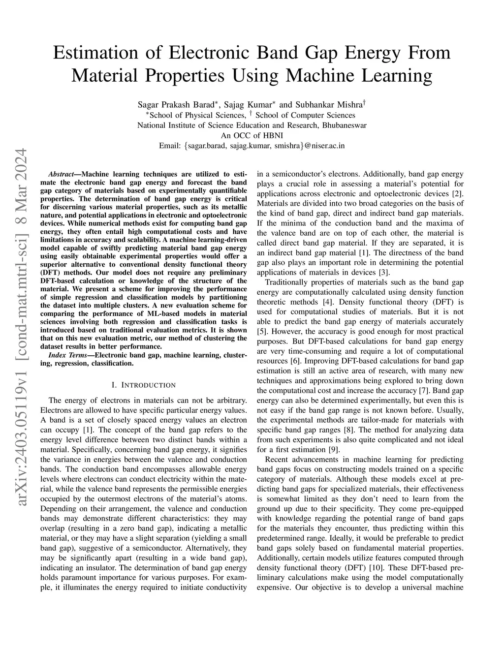 Machine learning techniques are utilized to estimate the electronic band gap energy and forecast the band gap category of materials based on experimentally quantifiable properties. The determination of band gap energy is critical for discerning various material properties, such as its metallic nature, and potential applications in electronic and optoelectronic devices. While numerical methods exist for computing band gap energy, they often entail high computational costs and have limitations in accuracy and scalability. A machine learning-driven model capable of swiftly predicting material band gap energy using easily obtainable experimental properties would offer a superior alternative to conventional density functional theory (DFT) methods. Our model does not require any preliminary DFT-based calculation or knowledge of the structure of the material. We present a scheme for improving the performance of simple regression and classification models by partitioning the dataset into multiple clusters. A new evaluation scheme for comparing the performance of ML-based models in material sciences involving both regression and classification tasks is introduced based on traditional evaluation metrics. It is shown that on this new evaluation metric, our method of clustering the dataset results in better performance.