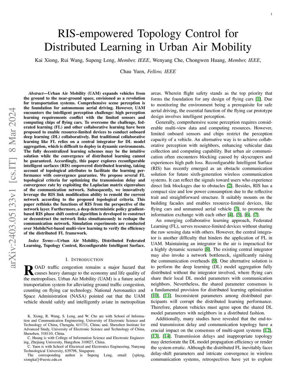Urban Air Mobility (UAM) expands vehicles from the ground to the near-ground space, envisioned as a revolution for transportation systems. Comprehensive scene perception is the foundation for autonomous aerial driving. However, UAM encounters the intelligent perception challenge: high perception learning requirements conflict with the limited sensors and computing chips of flying cars. To overcome the challenge, federated learning (FL) and other collaborative learning have been proposed to enable resource-limited devices to conduct onboard deep learning (DL) collaboratively. But traditional collaborative learning like FL relies on a central integrator for DL model aggregation, which is difficult to deploy in dynamic environments. The fully decentralized learning schemes may be the intuitive solution while the convergence of distributed learning cannot be guaranteed. Accordingly, this paper explores reconfigurable intelligent surfaces (RIS) empowered distributed learning, taking account of topological attributes to facilitate the learning performance with convergence guarantee. We propose several FL topological criteria for optimizing the transmission delay and convergence rate by exploiting the Laplacian matrix eigenvalues of the communication network. Subsequently, we innovatively leverage the RIS link modification ability to remold the current network according to the proposed topological criteria. This paper rethinks the functions of RIS from the perspective of the network layer. Furthermore, a deep deterministic policy gradient-based RIS phase shift control algorithm is developed to construct or deconstruct the network links simultaneously to reshape the communication network. Simulation experiments are conducted over MobileNet-based multi-view learning to verify the efficiency of the distributed FL framework.