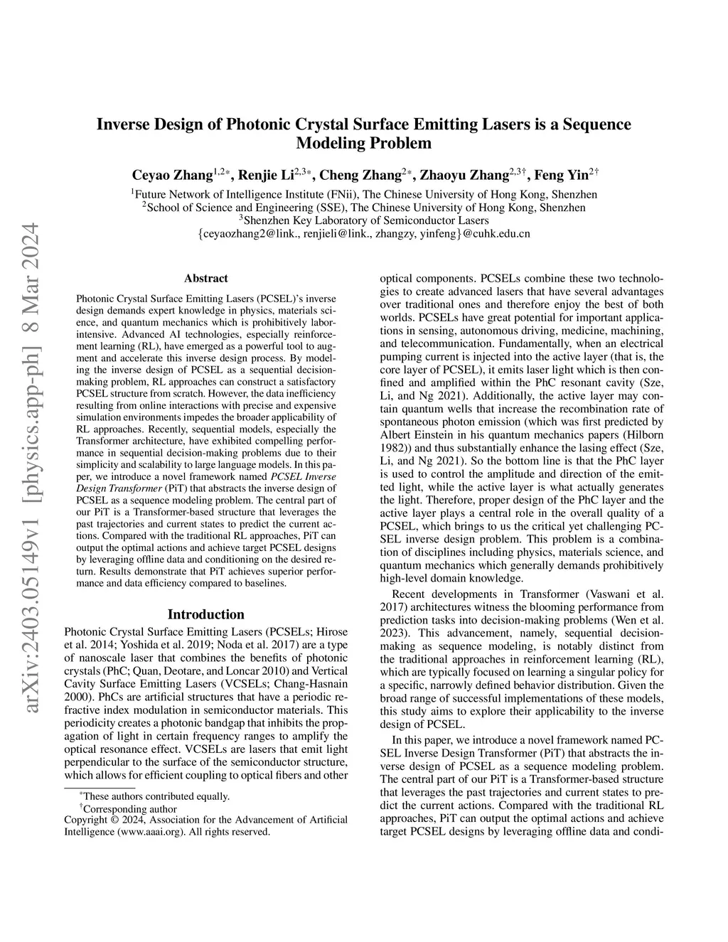 Photonic Crystal Surface Emitting Lasers (PCSEL)'s inverse design demands expert knowledge in physics, materials science, and quantum mechanics which is prohibitively labor-intensive. Advanced AI technologies, especially reinforcement learning (RL), have emerged as a powerful tool to augment and accelerate this inverse design process. By modeling the inverse design of PCSEL as a sequential decision-making problem, RL approaches can construct a satisfactory PCSEL structure from scratch. However, the data inefficiency resulting from online interactions with precise and expensive simulation environments impedes the broader applicability of RL approaches. Recently, sequential models, especially the Transformer architecture, have exhibited compelling performance in sequential decision-making problems due to their simplicity and scalability to large language models. In this paper, we introduce a novel framework named PCSEL Inverse Design Transformer (PiT) that abstracts the inverse design of PCSEL as a sequence modeling problem. The central part of our PiT is a Transformer-based structure that leverages the past trajectories and current states to predict the current actions. Compared with the traditional RL approaches, PiT can output the optimal actions and achieve target PCSEL designs by leveraging offline data and conditioning on the desired return. Results demonstrate that PiT achieves superior performance and data efficiency compared to baselines.