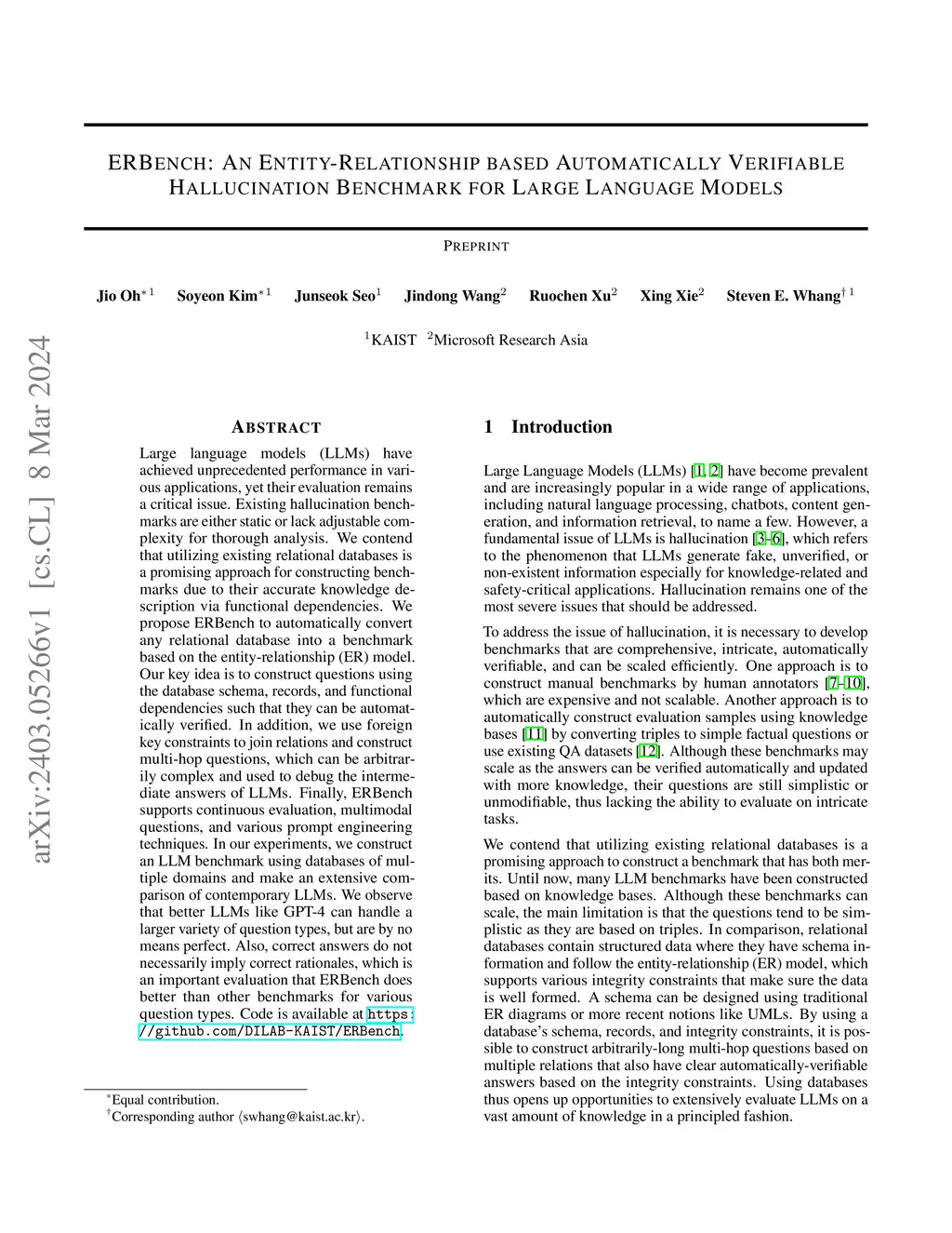 Large language models (LLMs) have achieved unprecedented performance in various applications, yet their evaluation remains a critical issue. Existing hallucination benchmarks are either static or lack adjustable complexity for thorough analysis. We contend that utilizing existing relational databases is a promising approach for constructing benchmarks due to their accurate knowledge description via functional dependencies. We propose ERBench to automatically convert any relational database into a benchmark based on the entity-relationship (ER) model. Our key idea is to construct questions using the database schema, records, and functional dependencies such that they can be automatically verified. In addition, we use foreign key constraints to join relations and construct multihop questions, which can be arbitrarily complex and used to debug the intermediate answers of LLMs. Finally, ERBench supports continuous evaluation, multimodal questions, and various prompt engineering techniques. In our experiments, we construct an LLM benchmark using databases of multiple domains and make an extensive comparison of contemporary LLMs. We observe that better LLMs like GPT-4 can handle a larger variety of question types, but are by no means perfect. Also, correct answers do not necessarily imply correct rationales, which is an important evaluation that ERBench does better than other benchmarks for various question types. Code is available at https: //github.com/DILAB-KAIST/ERBench.