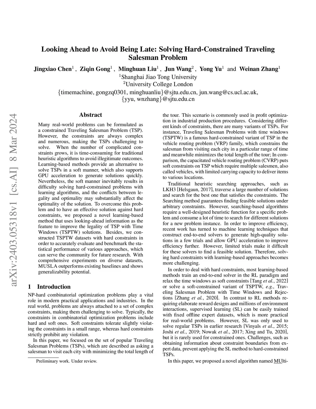 Many real-world problems can be formulated as a constrained Traveling Salesman Problem (TSP). However, the constraints are always complex and numerous, making the TSPs challenging to solve. When the number of complicated constraints grows, it is time-consuming for traditional heuristic algorithms to avoid illegitimate outcomes. Learning-based methods provide an alternative to solve TSPs in a soft manner, which also supports GPU acceleration to generate solutions quickly. Nevertheless, the soft manner inevitably results in difficulty solving hard-constrained problems with learning algorithms, and the conflicts between legality and optimality may substantially affect the optimality of the solution. To overcome this problem and to have an effective solution against hard constraints, we proposed a novel learning-based method that uses looking-ahead information as the feature to improve the legality of TSP with Time Windows (TSPTW) solutions. Besides, we constructed TSPTW datasets with hard constraints in order to accurately evaluate and benchmark the statistical performance of various approaches, which can serve the community for future research. With comprehensive experiments on diverse datasets, MUSLA outperforms existing baselines and shows generalizability potential.