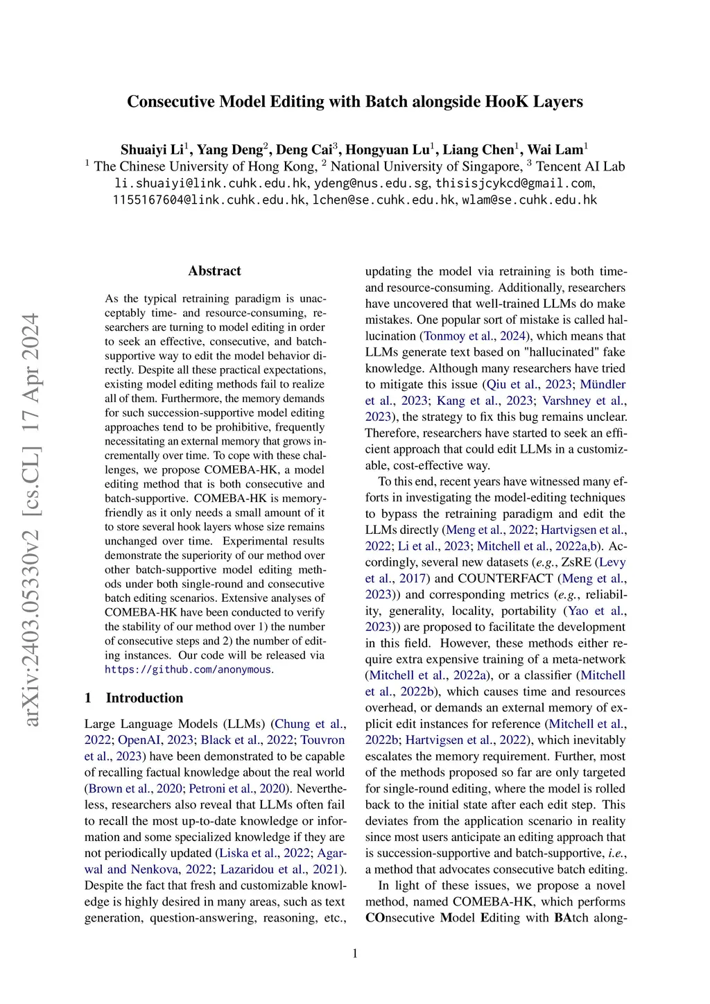 Consecutive Model Editing with Batch alongside HooK Layers