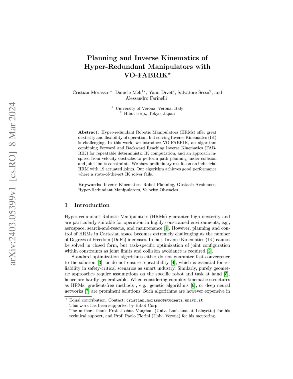 Hyper-redundant Robotic Manipulators (HRMs) offer great dexterity and flexibility of operation, but solving Inverse Kinematics (IK) is challenging. In this work, we introduce VO-FABRIK, an algorithm combining Forward and Backward Reaching Inverse Kinematics (FABRIK) for repeatable deterministic IK computation, and an approach inspired from velocity obstacles to perform path planning under collision and joint limits constraints. We show preliminary results on an industrial HRM with 19 actuated joints. Our algorithm achieves good performance where a state-of-the-art IK solver fails.