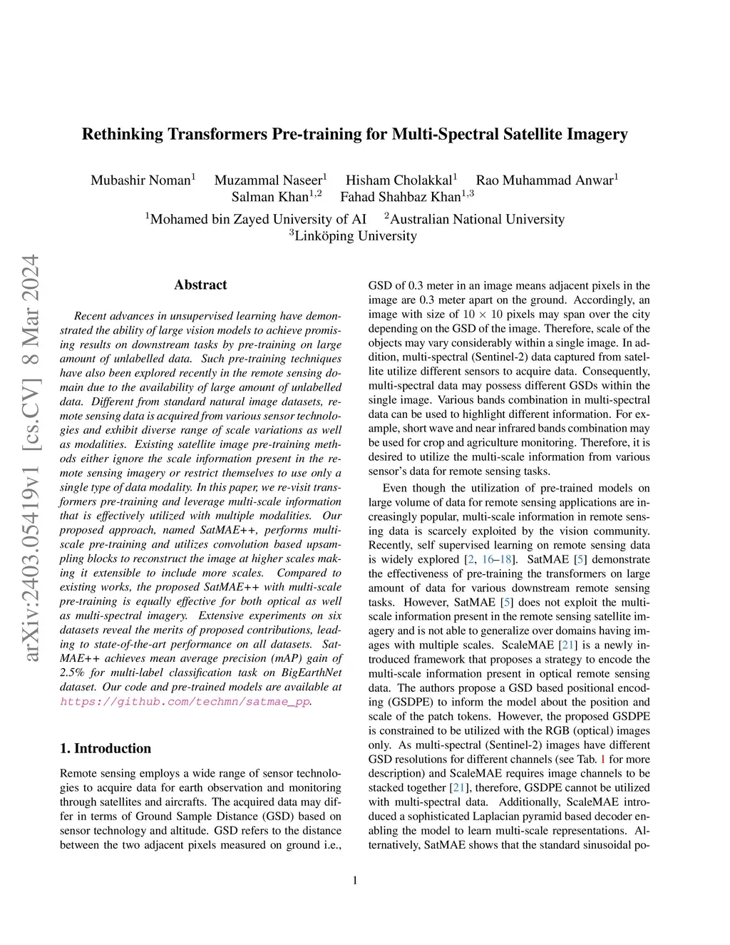 Recent advances in unsupervised learning have demonstrated the ability of large vision models to achieve promising results on downstream tasks by pre-training on large amount of unlabelled data. Such pre-training techniques have also been explored recently in the remote sensing domain due to the availability of large amount of unlabelled data. Different from standard natural image datasets, remote sensing data is acquired from various sensor technologies and exhibit diverse range of scale variations as well as modalities. Existing satellite image pre-training methods either ignore the scale information present in the remote sensing imagery or restrict themselves to use only a single type of data modality. In this paper, we re-visit transformers pre-training and leverage multi-scale information that is effectively utilized with multiple modalities. Our proposed approach, named SatMAE++, performs multi-scale pre-training and utilizes convolution based upsampling blocks to reconstruct the image at higher scales making it extensible to include more scales. Compared to existing works, the proposed SatMAE++ with multi-scale pre-training is equally effective for both optical as well as multi-spectral imagery. Extensive experiments on six datasets reveal the merits of proposed contributions, leading to state-of-the-art performance on all datasets. SatMAE++ achieves mean average precision (mAP) gain of 2.5\% for multi-label classification task on BigEarthNet dataset. Our code and pre-trained models are available at \url{https://github.com/techmn/satmae_pp}.