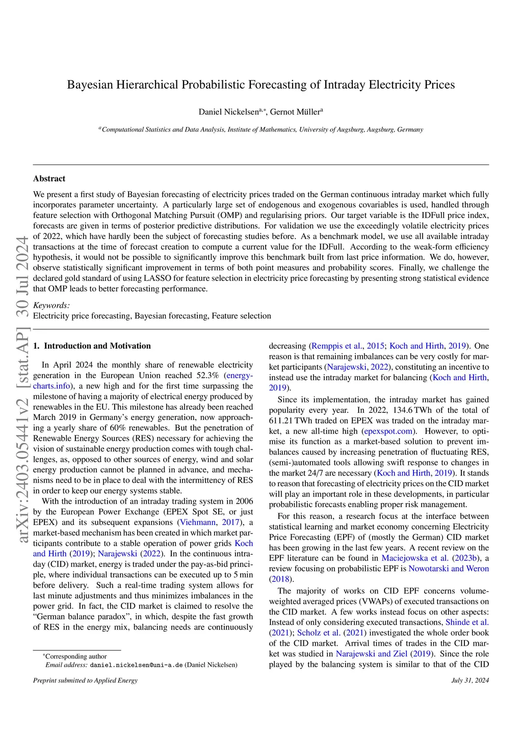 Bayesian Hierarchical Probabilistic Forecasting of Intraday Electricity
