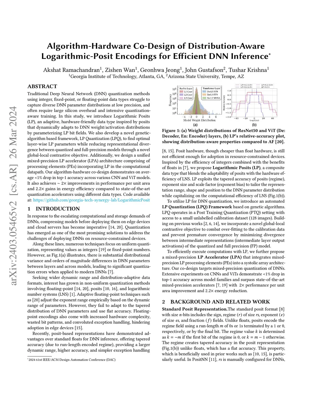 Traditional Deep Neural Network (DNN) quantization methods using integer, fixed-point, or floating-point data types struggle to capture diverse DNN parameter distributions at low precision, and often require large silicon overhead and intensive quantization-aware training. In this study, we introduce Logarithmic Posits (LP), an adaptive, hardware-friendly data type inspired by posits that dynamically adapts to DNN weight/activation distributions by parameterizing LP bit fields. We also develop a novel genetic-algorithm based framework, LP Quantization (LPQ), to find optimal layer-wise LP parameters while reducing representational divergence between quantized and full-precision models through a novel global-local contrastive objective. Additionally, we design a unified mixed-precision LP accelerator (LPA) architecture comprising of processing elements (PEs) incorporating LP in the computational datapath. Our algorithm-hardware co-design demonstrates on average <1% drop in top-1 accuracy across various CNN and ViT models. It also achieves ~ 2x improvements in performance per unit area and 2.2x gains in energy efficiency compared to state-of-the-art quantization accelerators using different data types.