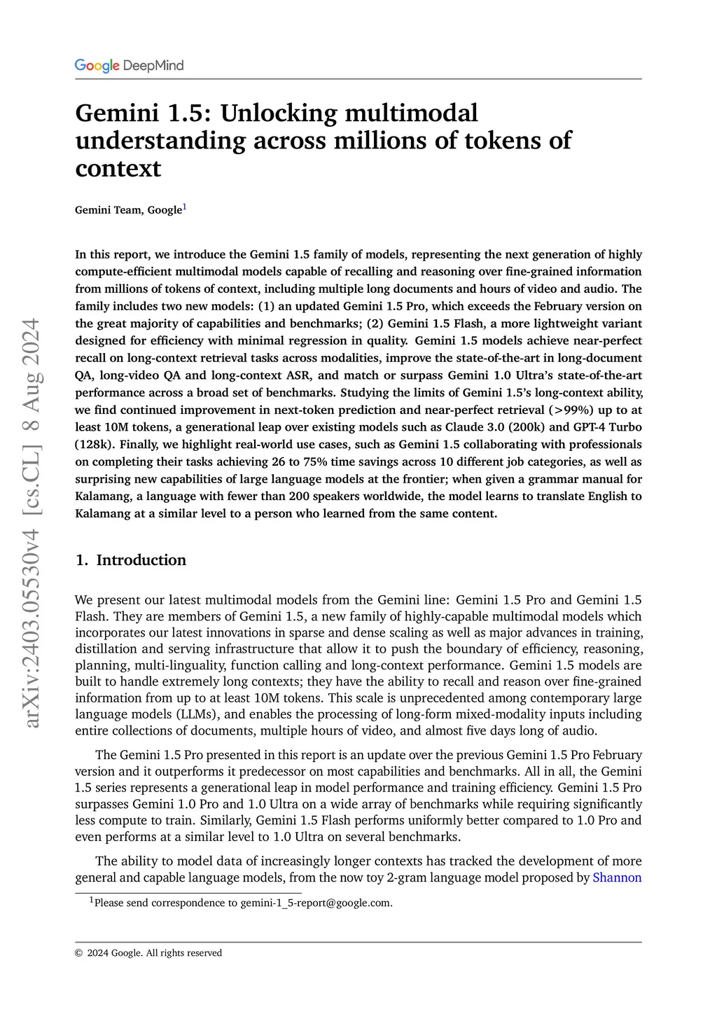 In this report, we introduce the Gemini 1.5 family of models, representing the next generation of highly compute-efficient multimodal models capable of recalling and reasoning over fine-grained information from millions of tokens of context, including multiple long documents and hours of video and audio. The family includes two new models: (1) an updated Gemini 1.5 Pro, which exceeds the February version on the great majority of capabilities and benchmarks; (2) Gemini 1.5 Flash, a more lightweight variant designed for efficiency with minimal regression in quality. Gemini 1.5 models achieve near-perfect recall on long-context retrieval tasks across modalities, improve the state-of-the-art in long-document QA, long-video QA and long-context ASR, and match or surpass Gemini 1.0 Ultra's state-of-the-art performance across a broad set of benchmarks. Studying the limits of Gemini 1.5's long-context ability, we find continued improvement in next-token prediction and near-perfect retrieval (>99%) up to at least 10M tokens, a generational leap over existing models such as Claude 3.0 (200k) and GPT-4 Turbo (128k). Finally, we highlight real-world use cases, such as Gemini 1.5 collaborating with professionals on completing their tasks achieving 26 to 75% time savings across 10 different job categories, as well as surprising new capabilities of large language models at the frontier; when given a grammar manual for Kalamang, a language with fewer than 200 speakers worldwide, the model learns to translate English to Kalamang at a similar level to a person who learned from the same content.