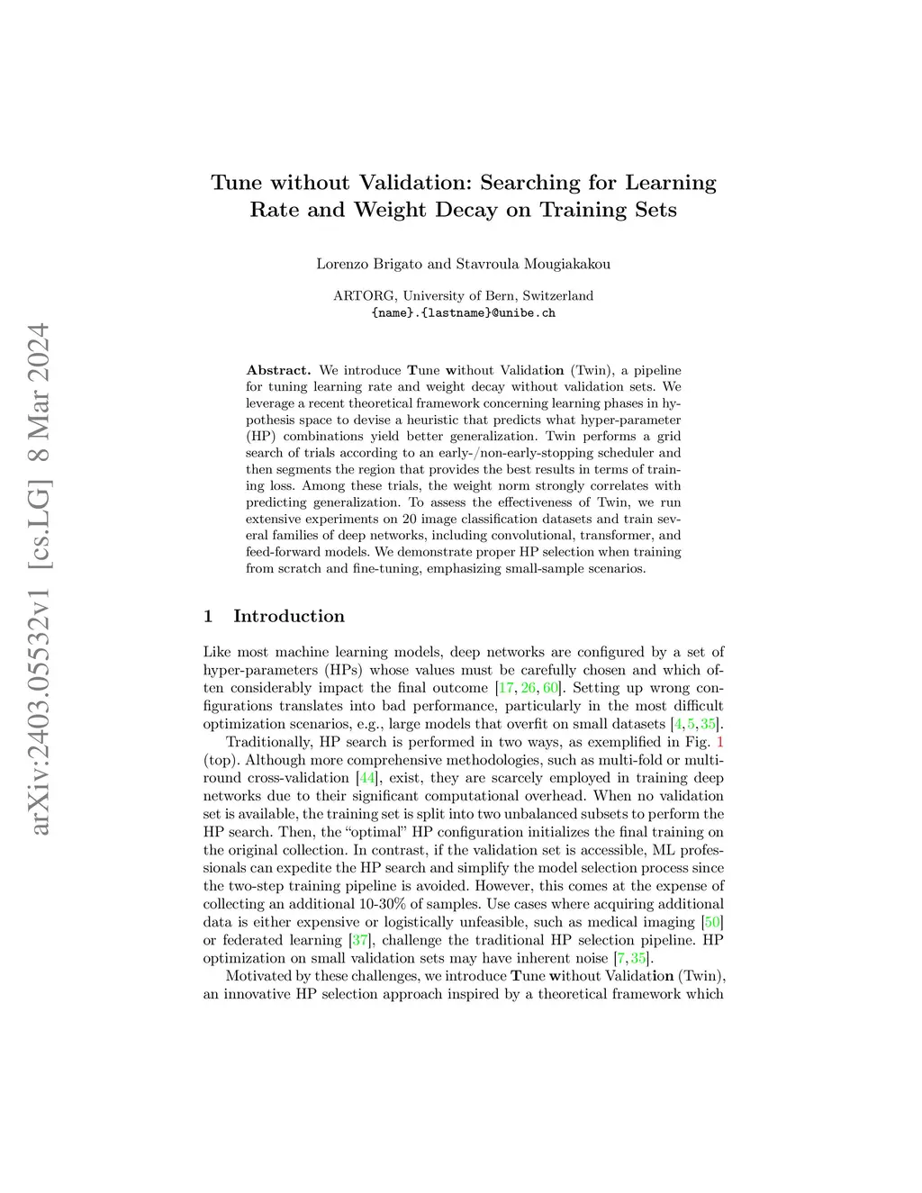 We introduce Tune without Validation (Twin), a pipeline for tuning learning rate and weight decay without validation sets. We leverage a recent theoretical framework concerning learning phases in hypothesis space to devise a heuristic that predicts what hyper-parameter (HP) combinations yield better generalization. Twin performs a grid search of trials according to an early-/non-early-stopping scheduler and then segments the region that provides the best results in terms of training loss. Among these trials, the weight norm strongly correlates with predicting generalization. To assess the effectiveness of Twin, we run extensive experiments on 20 image classification datasets and train several families of deep networks, including convolutional, transformer, and feed-forward models. We demonstrate proper HP selection when training from scratch and fine-tuning, emphasizing small-sample scenarios.
