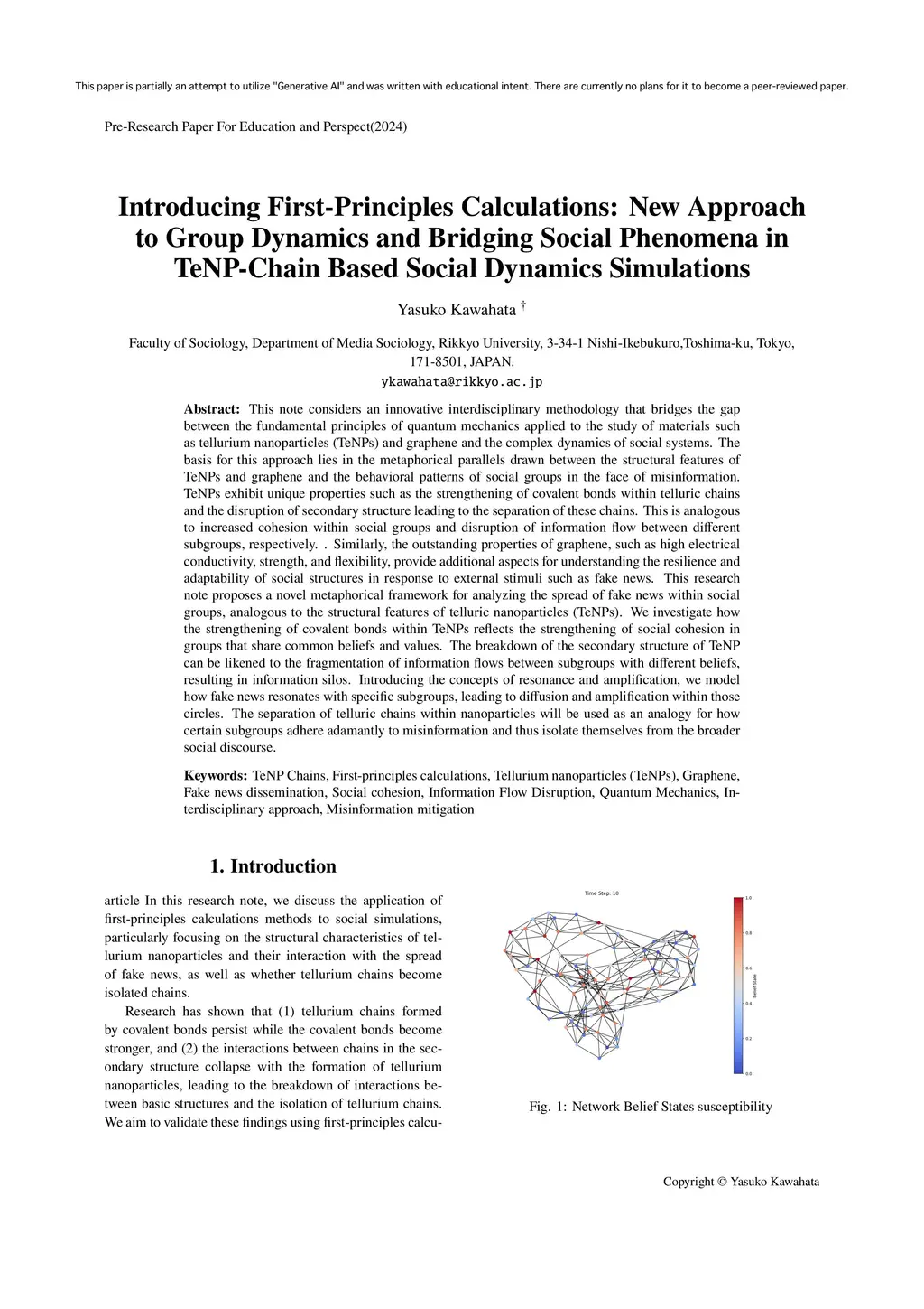 This note considers an innovative interdisciplinary methodology that bridges the gap between the fundamental principles of quantum mechanics applied to the study of materials such as tellurium nanoparticles (TeNPs) and graphene and the complex dynamics of social systems. The basis for this approach lies in the metaphorical parallels drawn between the structural features of TeNPs and graphene and the behavioral patterns of social groups in the face of misinformation. TeNPs exhibit unique properties such as the strengthening of covalent bonds within telluric chains and the disruption of secondary structure leading to the separation of these chains. This is analogous to increased cohesion within social groups and disruption of information flow between different subgroups, respectively. . Similarly, the outstanding properties of graphene, such as high electrical conductivity, strength, and flexibility, provide additional aspects for understanding the resilience and adaptability of social structures in response to external stimuli such as fake news. This research note proposes a novel metaphorical framework for analyzing the spread of fake news within social groups, analogous to the structural features of telluric nanoparticles (TeNPs). We investigate how the strengthening of covalent bonds within TeNPs reflects the strengthening of social cohesion in groups that share common beliefs and values. This paper is partially an attempt to utilize "Generative AI" and was written with educational intent. There are currently no plans for it to become a peer-reviewed paper.