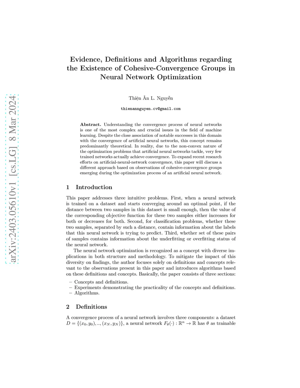 Understanding the convergence process of neural networks is one of the most complex and crucial issues in the field of machine learning. Despite the close association of notable successes in this domain with the convergence of artificial neural networks, this concept remains predominantly theoretical. In reality, due to the non-convex nature of the optimization problems that artificial neural networks tackle, very few trained networks actually achieve convergence. To expand recent research efforts on artificial-neural-network convergence, this paper will discuss a different approach based on observations of cohesive-convergence groups emerging during the optimization process of an artificial neural network.