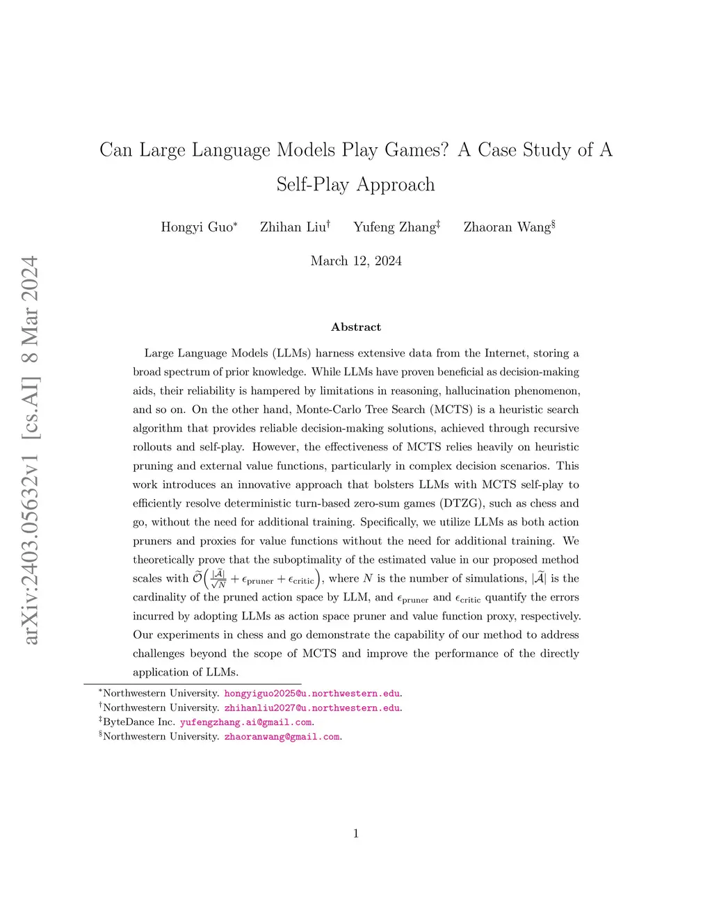 Large Language Models (LLMs) harness extensive data from the Internet, storing a broad spectrum of prior knowledge. While LLMs have proven beneficial as decision-making aids, their reliability is hampered by limitations in reasoning, hallucination phenomenon, and so on. On the other hand, Monte-Carlo Tree Search (MCTS) is a heuristic search algorithm that provides reliable decision-making solutions, achieved through recursive rollouts and self-play. However, the effectiveness of MCTS relies heavily on heuristic pruning and external value functions, particularly in complex decision scenarios. This work introduces an innovative approach that bolsters LLMs with MCTS self-play to efficiently resolve deterministic turn-based zero-sum games (DTZG), such as chess and go, without the need for additional training. Specifically, we utilize LLMs as both action pruners and proxies for value functions without the need for additional training. We theoretically prove that the suboptimality of the estimated value in our proposed method scales with , where \(N\) is the number of simulations, is the cardinality of the pruned action space by LLM, and and quantify the errors incurred by adopting LLMs as action space pruner and value function proxy, respectively. Our experiments in chess and go demonstrate the capability of our method to address challenges beyond the scope of MCTS and improve the performance of the directly application of LLMs.