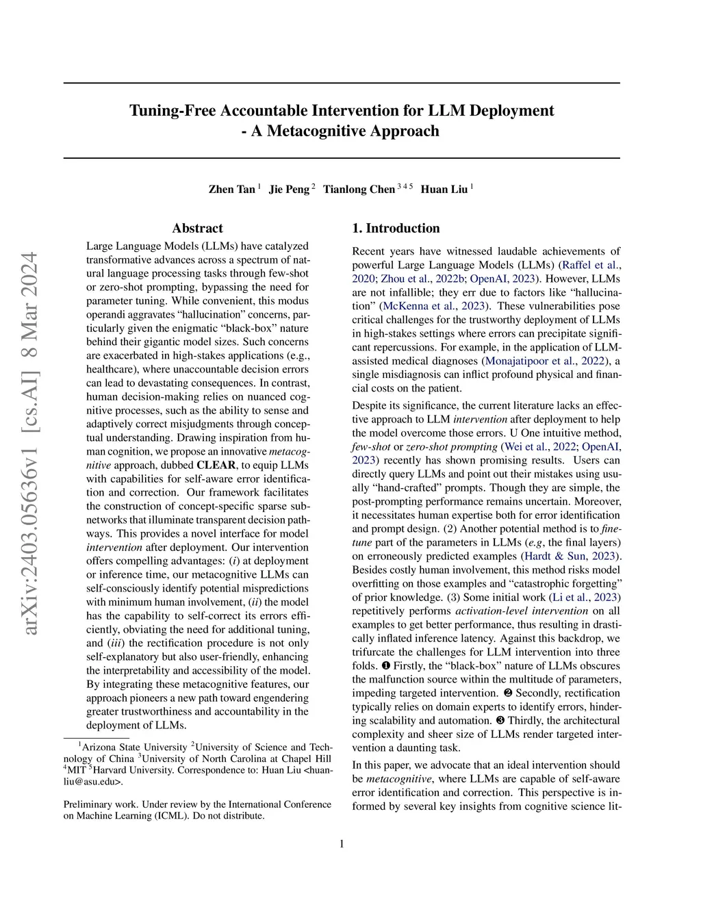 Large Language Models (LLMs) have catalyzed transformative advances across a spectrum of natural language processing tasks through few-shot or zero-shot prompting, bypassing the need for parameter tuning. While convenient, this modus operandi aggravates ``hallucination'' concerns, particularly given the enigmatic ``black-box'' nature behind their gigantic model sizes. Such concerns are exacerbated in high-stakes applications (e.g., healthcare), where unaccountable decision errors can lead to devastating consequences. In contrast, human decision-making relies on nuanced cognitive processes, such as the ability to sense and adaptively correct misjudgments through conceptual understanding. Drawing inspiration from human cognition, we propose an innovative \textit{metacognitive} approach, dubbed \textbf{CLEAR}, to equip LLMs with capabilities for self-aware error identification and correction. Our framework facilitates the construction of concept-specific sparse subnetworks that illuminate transparent decision pathways. This provides a novel interface for model \textit{intervention} after deployment. Our intervention offers compelling advantages: (\textit{i})~at deployment or inference time, our metacognitive LLMs can self-consciously identify potential mispredictions with minimum human involvement, (\textit{ii})~the model has the capability to self-correct its errors efficiently, obviating the need for additional tuning, and (\textit{iii})~the rectification procedure is not only self-explanatory but also user-friendly, enhancing the interpretability and accessibility of the model. By integrating these metacognitive features, our approach pioneers a new path toward engendering greater trustworthiness and accountability in the deployment of LLMs.
