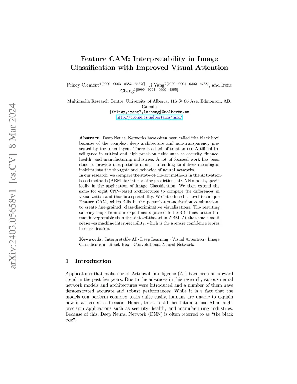 Deep Neural Networks have often been called the black box because of the complex, deep architecture and non-transparency presented by the inner layers. There is a lack of trust to use Artificial Intelligence in critical and high-precision fields such as security, finance, health, and manufacturing industries. A lot of focused work has been done to provide interpretable models, intending to deliver meaningful insights into the thoughts and behavior of neural networks. In our research, we compare the state-of-the-art methods in the Activation-based methods (ABM) for interpreting predictions of CNN models, specifically in the application of Image Classification. We then extend the same for eight CNN-based architectures to compare the differences in visualization and thus interpretability. We introduced a novel technique Feature CAM, which falls in the perturbation-activation combination, to create fine-grained, class-discriminative visualizations. The resulting saliency maps from our experiments proved to be 3-4 times better human interpretable than the state-of-the-art in ABM. At the same time it reserves machine interpretability, which is the average confidence scores in classification.