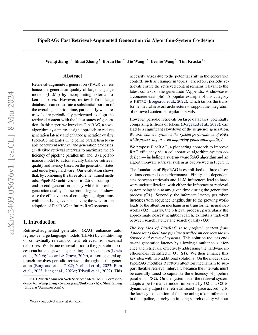 PipeRAG: Fast Retrieval-Augmented Generation via Algorithm-System