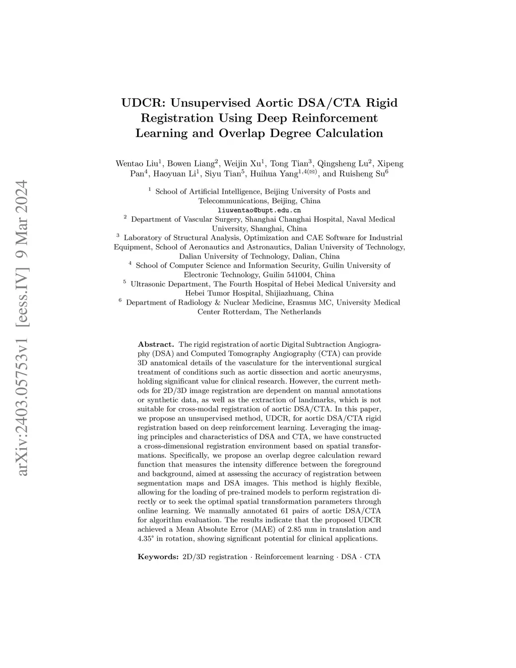 UDCR: Unsupervised Aortic DSA/CTA Rigid Registration Using Deep