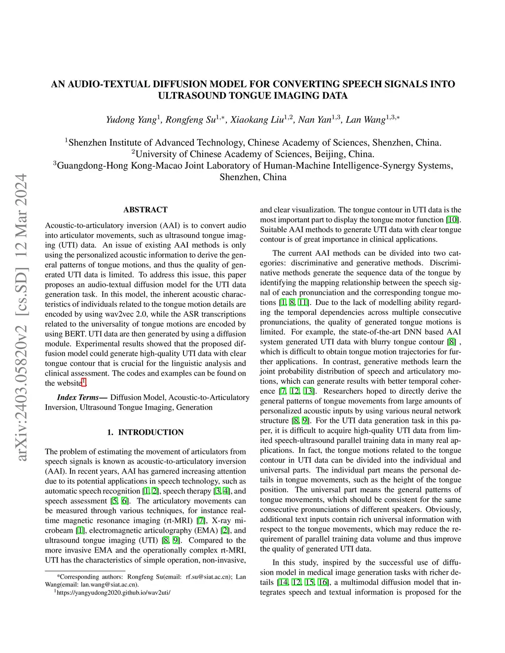 Acoustic-to-articulatory inversion (AAI) is to convert audio into articulator movements, such as ultrasound tongue imaging (UTI) data. An issue of existing AAI methods is only using the personalized acoustic information to derive the general patterns of tongue motions, and thus the quality of generated UTI data is limited. To address this issue, this paper proposes an audio-textual diffusion model for the UTI data generation task. In this model, the inherent acoustic characteristics of individuals related to the tongue motion details are encoded by using wav2vec 2.0, while the ASR transcriptions related to the universality of tongue motions are encoded by using BERT. UTI data are then generated by using a diffusion module. Experimental results showed that the proposed diffusion model could generate high-quality UTI data with clear tongue contour that is crucial for the linguistic analysis and clinical assessment. The project can be found on the website\footnote{https://yangyudong2020.github.io/wav2uti/
