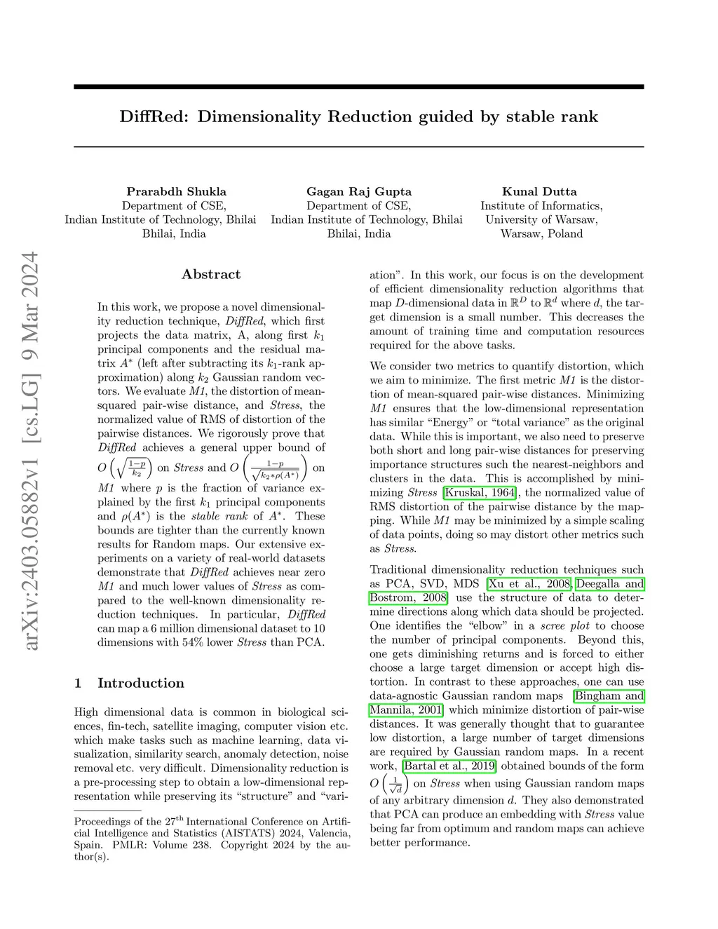 In this work, we propose a novel dimensionality reduction technique, DiffRed, which first projects the data matrix, A, along first principal components and the residual matrix (left after subtracting its -rank approximation) along Gaussian random vectors. We evaluate M1, the distortion of mean-squared pair-wise distance, and Stress, the normalized value of RMS of distortion of the pairwise distances. We rigorously prove that DiffRed achieves a general upper bound of on Stress and on M1 where is the fraction of variance explained by the first principal components and is the stable rank of . These bounds are tighter than the currently known results for Random maps. Our extensive experiments on a variety of real-world datasets demonstrate that DiffRed achieves near zero M1 and much lower values of Stress as compared to the well-known dimensionality reduction techniques. In particular, DiffRed can map a 6 million dimensional dataset to 10 dimensions with 54% lower Stress than PCA.
