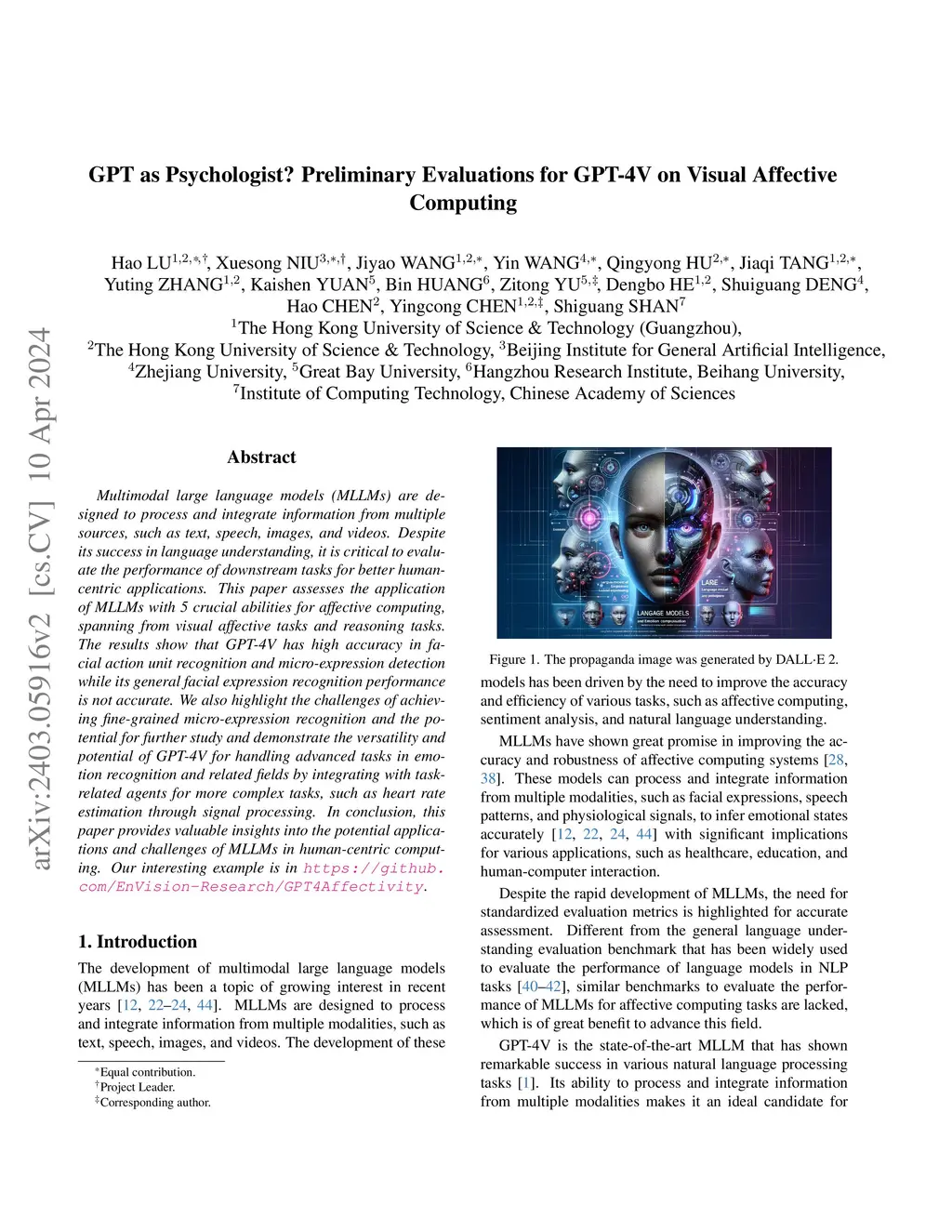 Multimodal large language models (MLLMs) are designed to process and integrate information from multiple sources, such as text, speech, images, and videos. Despite its success in language understanding, it is critical to evaluate the performance of downstream tasks for better human-centric applications. This paper assesses the application of MLLMs with 5 crucial abilities for affective computing, spanning from visual affective tasks and reasoning tasks. The results show that \gpt has high accuracy in facial action unit recognition and micro-expression detection while its general facial expression recognition performance is not accurate. We also highlight the challenges of achieving fine-grained micro-expression recognition and the potential for further study and demonstrate the versatility and potential of \gpt for handling advanced tasks in emotion recognition and related fields by integrating with task-related agents for more complex tasks, such as heart rate estimation through signal processing. In conclusion, this paper provides valuable insights into the potential applications and challenges of MLLMs in human-centric computing. Our interesting examples are at https://github.com/EnVision-Research/GPT4Affectivity.