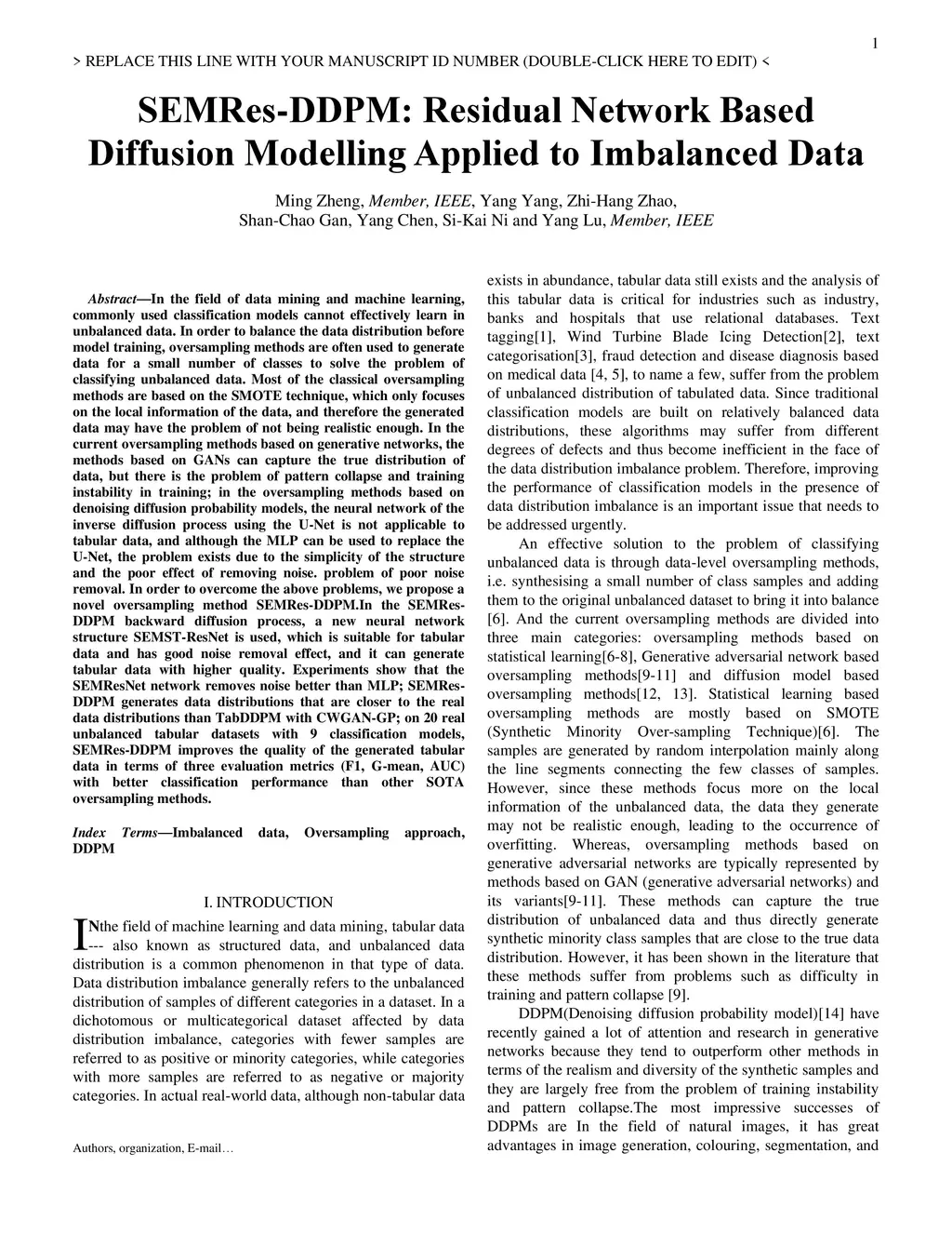 In the field of data mining and machine learning, commonly used classification models cannot effectively learn in unbalanced data. In order to balance the data distribution before model training, oversampling methods are often used to generate data for a small number of classes to solve the problem of classifying unbalanced data. Most of the classical oversampling methods are based on the SMOTE technique, which only focuses on the local information of the data, and therefore the generated data may have the problem of not being realistic enough. In the current oversampling methods based on generative networks, the methods based on GANs can capture the true distribution of data, but there is the problem of pattern collapse and training instability in training; in the oversampling methods based on denoising diffusion probability models, the neural network of the inverse diffusion process using the U-Net is not applicable to tabular data, and although the MLP can be used to replace the U-Net, the problem exists due to the simplicity of the structure and the poor effect of removing noise. problem of poor noise removal. In order to overcome the above problems, we propose a novel oversampling method SEMRes-DDPM.In the SEMRes-DDPM backward diffusion process, a new neural network structure SEMST-ResNet is used, which is suitable for tabular data and has good noise removal effect, and it can generate tabular data with higher quality. Experiments show that the SEMResNet network removes noise better than MLP; SEMRes-DDPM generates data distributions that are closer to the real data distributions than TabDDPM with CWGAN-GP; on 20 real unbalanced tabular datasets with 9 classification models, SEMRes-DDPM improves the quality of the generated tabular data in terms of three evaluation metrics (F1, G-mean, AUC) with better classification performance than other SOTA oversampling methods.