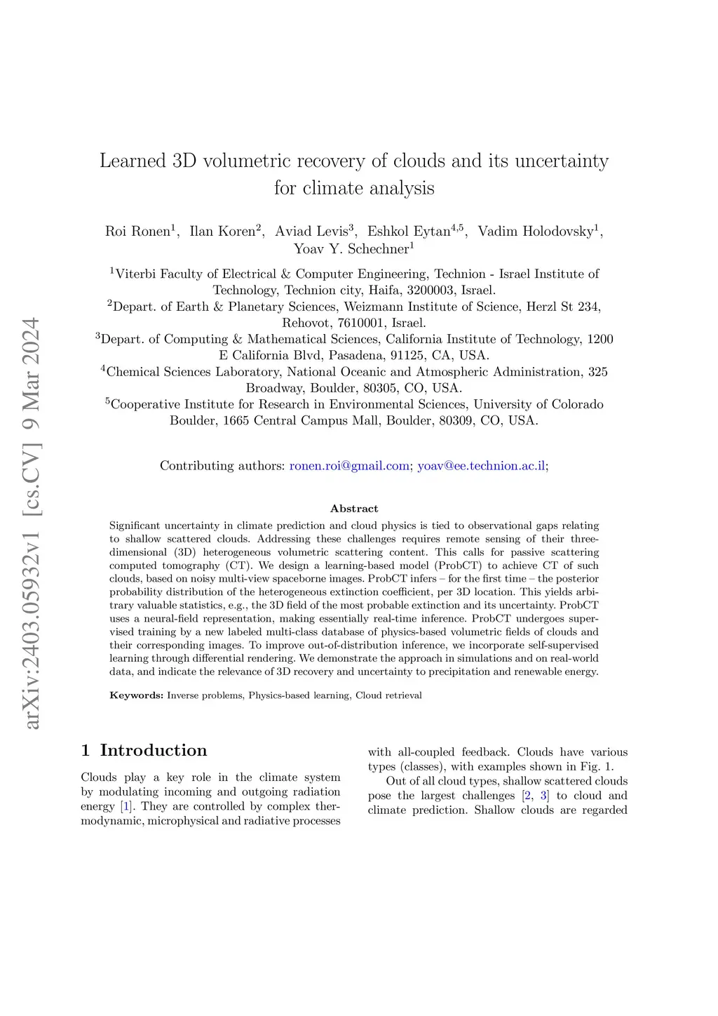 Learned 3D volumetric recovery of clouds and its uncertainty for climate