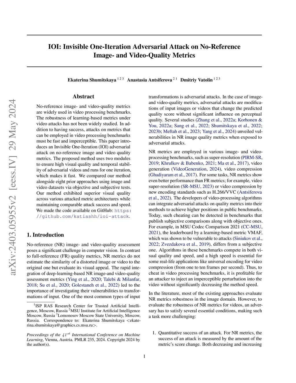 No-reference image- and video-quality metrics are widely used in video processing benchmarks. The robustness of learning-based metrics under video attacks has not been widely studied. In addition to having success, attacks that can be employed in video processing benchmarks must be fast and imperceptible. This paper introduces an Invisible One-Iteration (IOI) adversarial attack on no reference image and video quality metrics. We compared our method alongside eight prior approaches using image and video datasets via objective and subjective tests. Our method exhibited superior visual quality across various attacked metric architectures while maintaining comparable attack success and speed. We made the code available on GitHub: https://github.com/katiashh/ioi-attack.