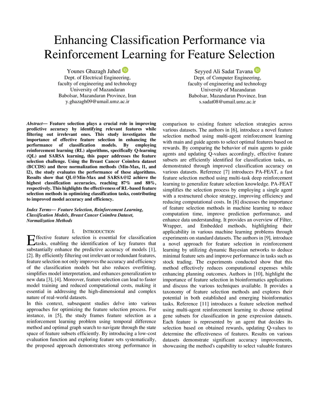 Feature selection plays a crucial role in improving predictive accuracy by identifying relevant features while filtering out irrelevant ones. This study investigates the importance of effective feature selection in enhancing the performance of classification models. By employing reinforcement learning (RL) algorithms, specifically Q-learning (QL) and SARSA learning, this paper addresses the feature selection challenge. Using the Breast Cancer Coimbra dataset (BCCDS) and three normalization methods (Min-Max, l1, and l2), the study evaluates the performance of these algorithms. Results show that QL@Min-Max and SARSA@l2 achieve the highest classification accuracies, reaching 87% and 88%, respectively. This highlights the effectiveness of RL-based feature selection methods in optimizing classification tasks, contributing to improved model accuracy and efficiency.
