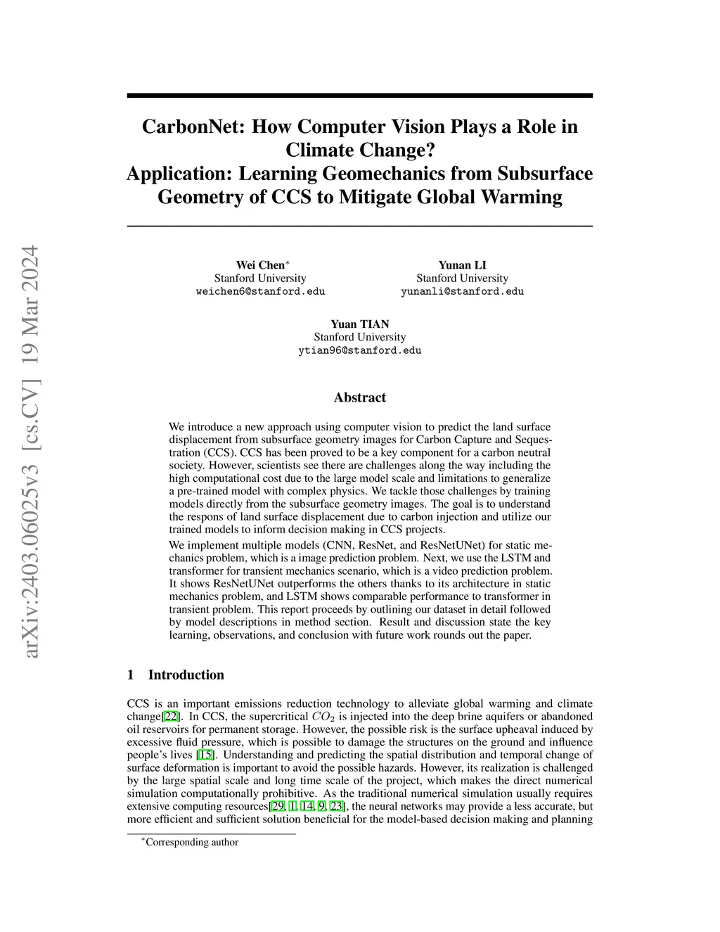 We introduce a new approach using computer vision to predict the land surface displacement from subsurface geometry images for Carbon Capture and Sequestration (CCS). CCS has been proved to be a key component for a carbon neutral society. However, scientists see there are challenges along the way including the high computational cost due to the large model scale and limitations to generalize a pre-trained model with complex physics. We tackle those challenges by training models directly from the subsurface geometry images. The goal is to understand the respons of land surface displacement due to carbon injection and utilize our trained models to inform decision making in CCS projects. We implement multiple models (CNN, ResNet, and ResNetUNet) for static mechanics problem, which is a image prediction problem. Next, we use the LSTM and transformer for transient mechanics scenario, which is a video prediction problem. It shows ResNetUNet outperforms the others thanks to its architecture in static mechanics problem, and LSTM shows comparable performance to transformer in transient problem. This report proceeds by outlining our dataset in detail followed by model descriptions in method section. Result and discussion state the key learning, observations, and conclusion with future work rounds out the paper.