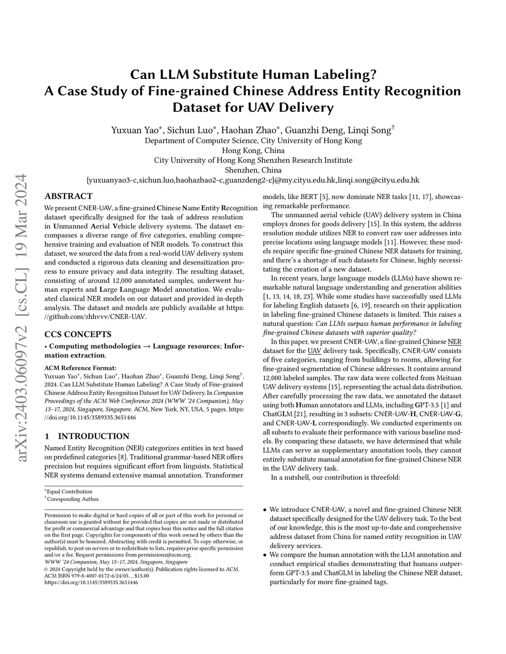 We present CNER-UAV, a fine-grained \textbf{C}hinese \textbf{N}ame \textbf{E}ntity \textbf{R}ecognition dataset specifically designed for the task of address resolution in \textbf{U}nmanned \textbf{A}erial \textbf{V}ehicle delivery systems. The dataset encompasses a diverse range of five categories, enabling comprehensive training and evaluation of NER models. To construct this dataset, we sourced the data from a real-world UAV delivery system and conducted a rigorous data cleaning and desensitization process to ensure privacy and data integrity. The resulting dataset, consisting of around 12,000 annotated samples, underwent human experts and \textbf{L}arge \textbf{L}anguage \textbf{M}odel annotation. We evaluated classical NER models on our dataset and provided in-depth analysis. The dataset and models are publicly available at \url{https://github.com/zhhvvv/CNER-UAV}.