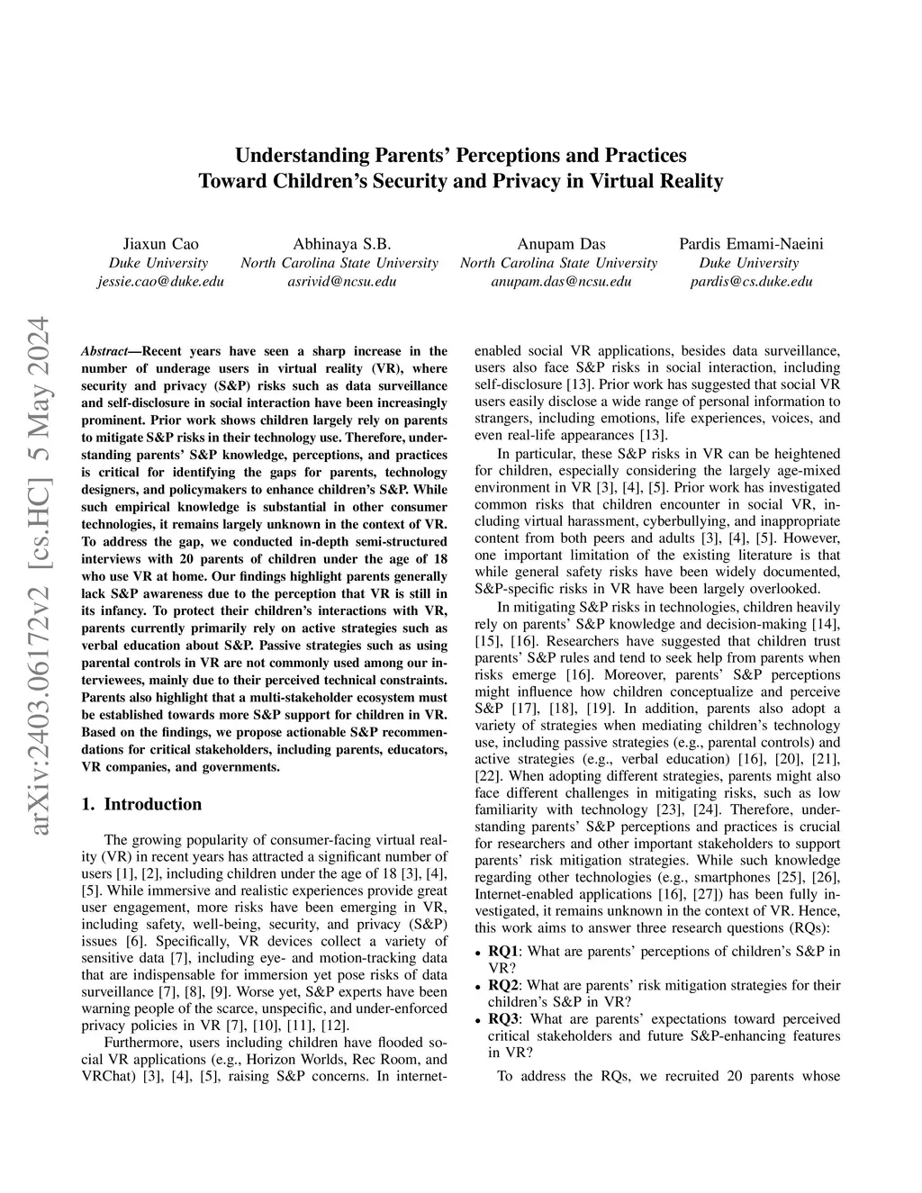 Recent years have seen a sharp increase in the number of underage users in virtual reality (VR), where security and privacy (S\&P) risks such as data surveillance and self-disclosure in social interaction have been increasingly prominent. Prior work shows children largely rely on parents to mitigate S\&P risks in their technology use. Therefore, understanding parents' S\&P knowledge, perceptions, and practices is critical for identifying the gaps for parents, technology designers, and policymakers to enhance children's S\&P. While such empirical knowledge is substantial in other consumer technologies, it remains largely unknown in the context of VR. To address the gap, we conducted in-depth semi-structured interviews with 20 parents of children under the age of 18 who use VR at home. Our findings highlight parents generally lack S\&P awareness due to the perception that VR is still in its infancy. To protect their children's interactions with VR, parents currently primarily rely on active strategies such as verbal education about S\&P. Passive strategies such as using parental controls in VR are not commonly used among our interviewees, mainly due to their perceived technical constraints. Parents also highlight that a multi-stakeholder ecosystem must be established towards more S\&P support for children in VR. Based on the findings, we propose actionable S\&P recommendations for critical stakeholders, including parents, educators, VR companies, and governments.